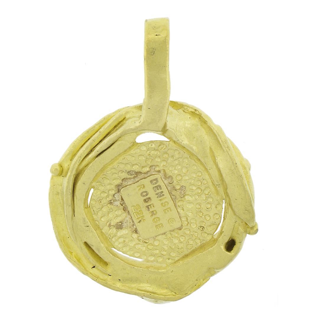 A solid 22k yellow gold coing pendant by Denise Roberge. The pendant weighs a total of 28.93 grams, measures 40x29.6mm including the bail, and the inside of the bail measures 9.7x6.2mm.