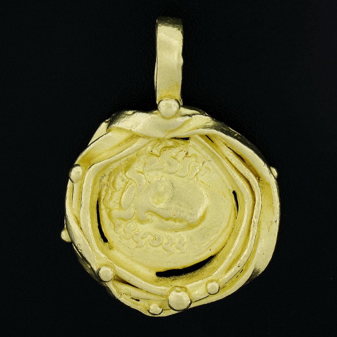 A solid 22k yellow gold coing pendant by Denise Roberge. The pendant weighs a total of 28.93 grams, measures 40x29.6mm including the bail, and the inside of the bail measures 9.7x6.2mm.