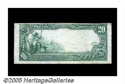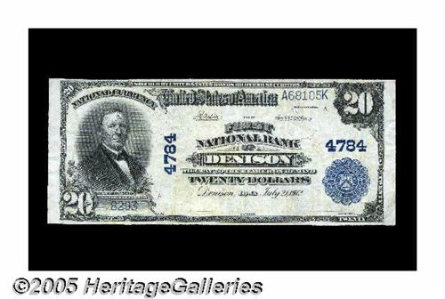 <B>Denison, IA</B></I> - $20 1902 Plain Back Fr. 654 <B>The First NB</B></I> Ch. # 4784<BR>A well-centered and bright <B>Very Fine,</B></I> with faded signatures. It comes from the only issuing bank in this Crawford County locale.