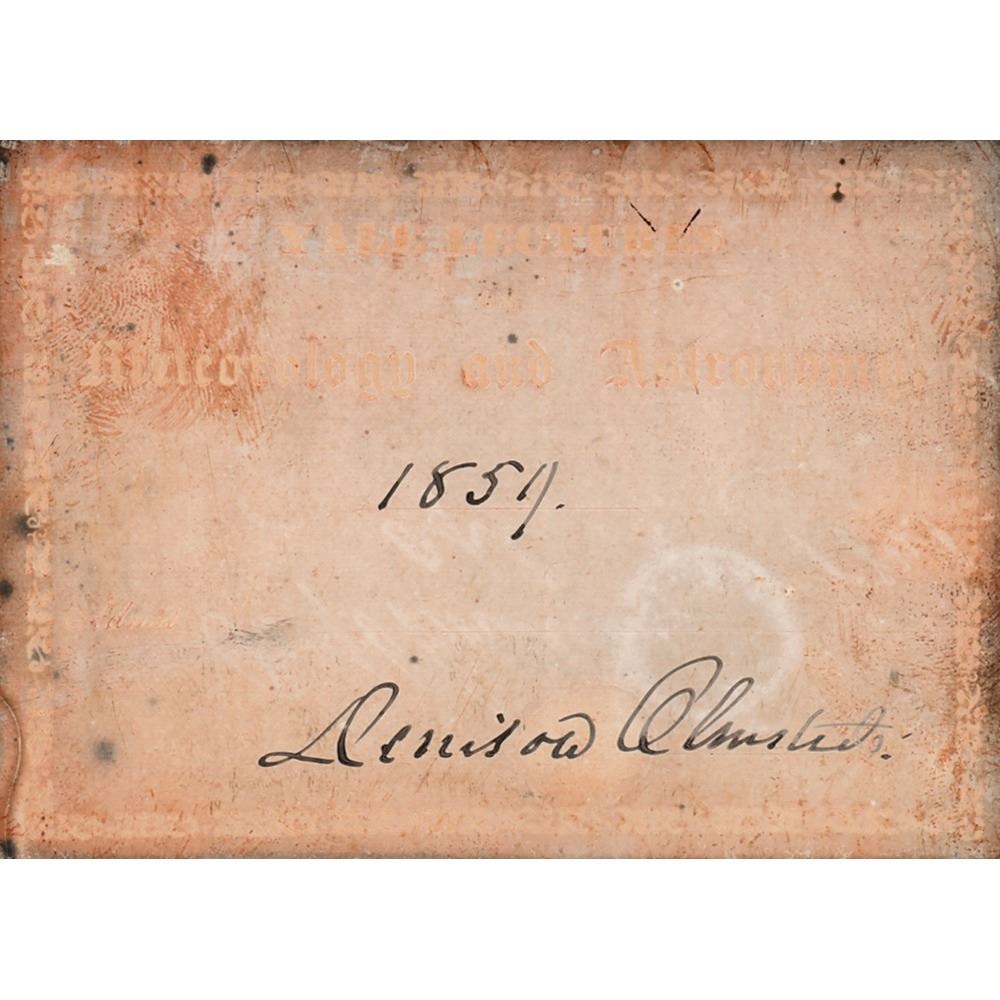 American physicist and astronomer (1791–1859) credited with giving birth to meteor science after the 1833 Leonid meteor shower over North America spurred him to study this phenomenon. Partly-printed admission pass for an 1854 "Yale Lecture on Meteorology and Astronomy," 3.5 x 2.5, neatly signed along the bottom in ink, "Denison Olmsted." In very good condition, with printed text extremely faded and soiling to edges.
