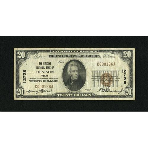 <B>Denison, TX</B></I> - $20 1929 Ty. 1 <B>The Citizens NB</B></I> Ch. # 12728<BR> This is a scarce note from this Val Verde County bank on the Rio Grande. <B>Fine</B></I>, with the engraved signatures of Henry Etter and W. B. Munson, Jr. as the officers. <BR><BR><b>Shipping:</b> Coins & Currency (<a target="_blank" href="http://www.heritageauctions.com/common/shipping.php">view shipping information</a>)