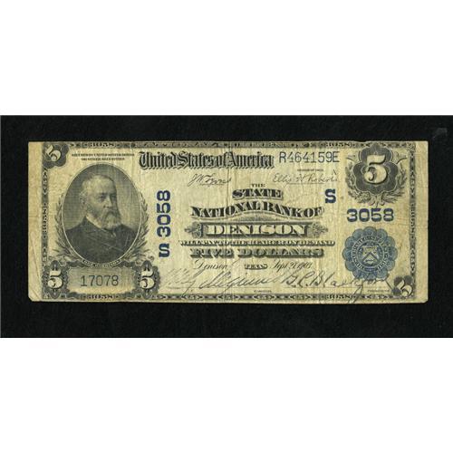 <B>Denison, TX</B></I> - $5 1902 Plain Back Fr. 598 <B>The State NB</B></I> Ch. # (S)3058<BR>This is a problem-free <B>Fine</B></I> with printed signatures of W.G. McGinnis and G.L. Blackford.<BR><BR><b>Shipping:</b> Coins & Currency (<a target="_blank" href="http://www.heritageauctions.com/common/shipping.php">view shipping information</a>)