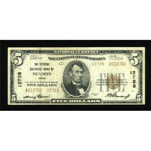<B>Denison, TX</B></I> - $5 1929 Ty. 2 <B>The Citizens NB</B></I> Ch. # 12728<BR> Henry Etter and W.B. Munson Jr managed this bank. <B>Fine+</B></I>.<BR><BR><b>Shipping:</b> Coins & Currency (<a target="_blank" href="http://www.heritageauctions.com/common/shipping.php">view shipping information</a>)
