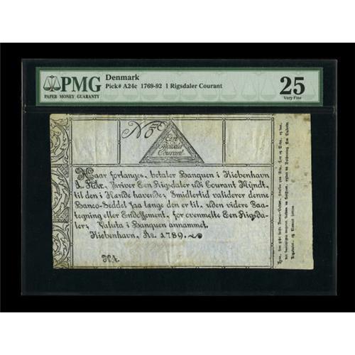 <B>Denmark</B></I> 1 Rigsdaler 1769-92 Pick A24c<BR> This pleasing example faces up nicely, but displays a touch of foxing on the back.<BR><B>PMG Very Fine 25.</B></I><BR><BR><b>Shipping:</b> Coins & Currency (<a target="_blank" href="http://www.heritageauctions.com/common/shipping.php">view shipping information</a>)