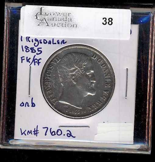 Denmark; 1 Rigsdaler 1855 FK/FF Orb, VF-30 KM #760.2.