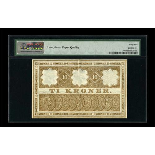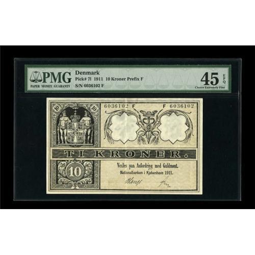 <B>Denmark</B></I> 10 Kroner 1911 Pick 7l Prefix F<BR> The inks remain sharp on this lightly circulated note. <B>PMG Extremely Fine 45 EPQ.</B></I><BR><BR><b>Shipping:</b> Coins & Currency (<a target="_blank" href="http://www.heritageauctions.com/common/shipping.php">view shipping information</a>)
