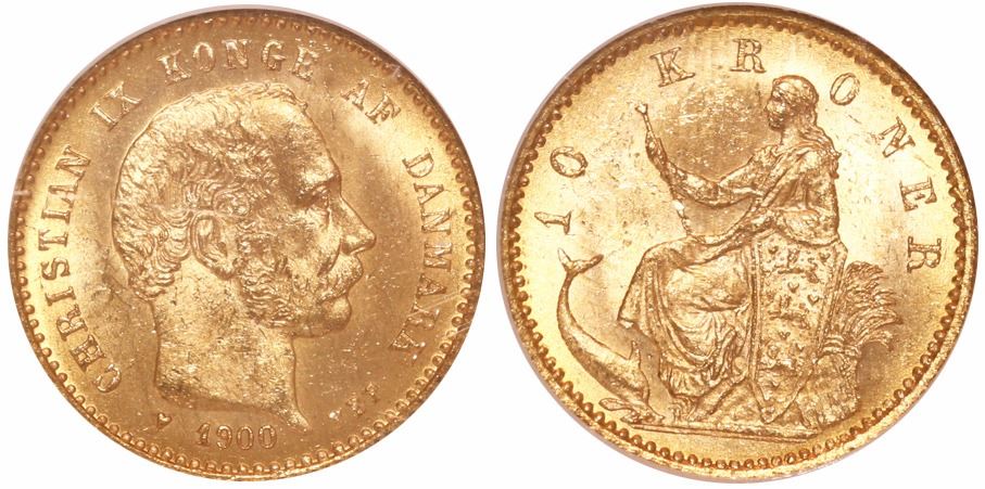 Denmark, 10 kroner, Christian IX, 1900-VBP, encapsulated NGC MS 65.
