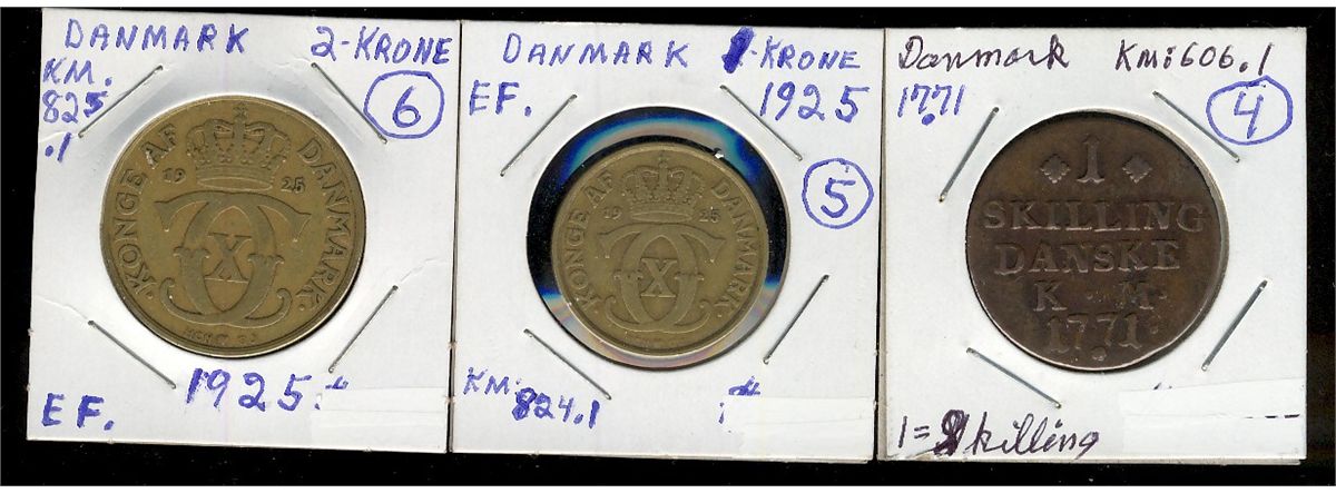 Denmark; 1771 1 Skilling, 1925 1 Krone and 2 krone. Three coins VF.