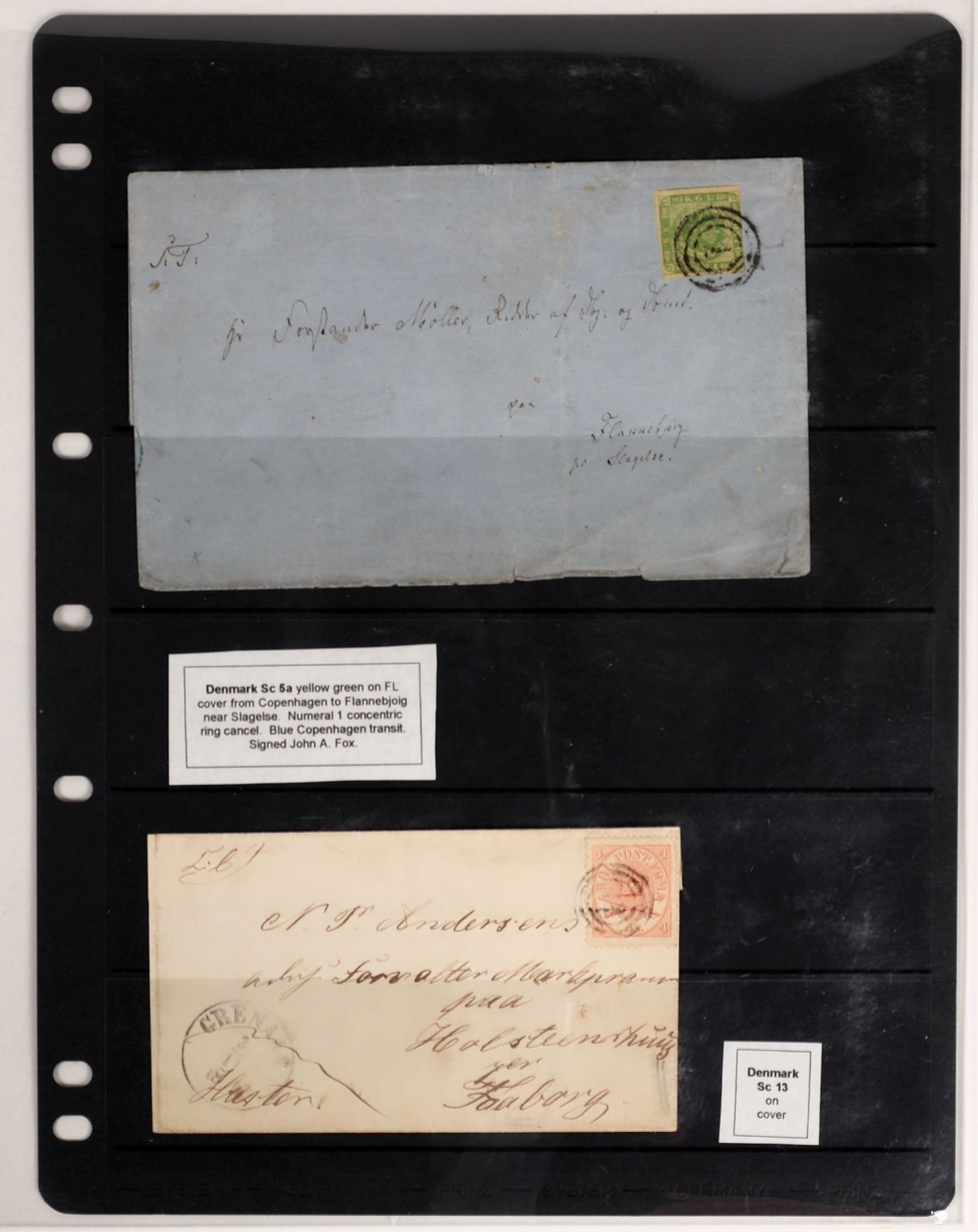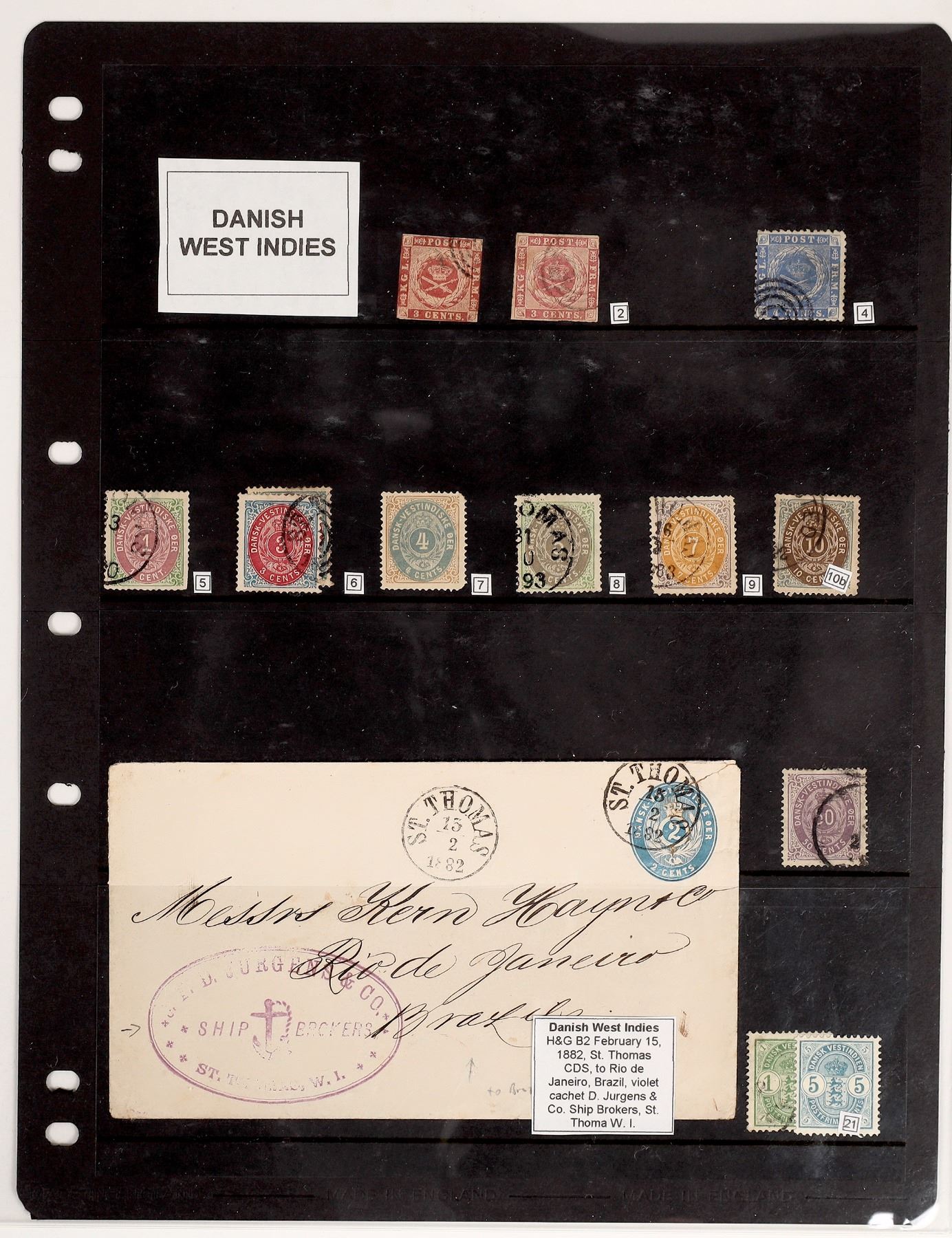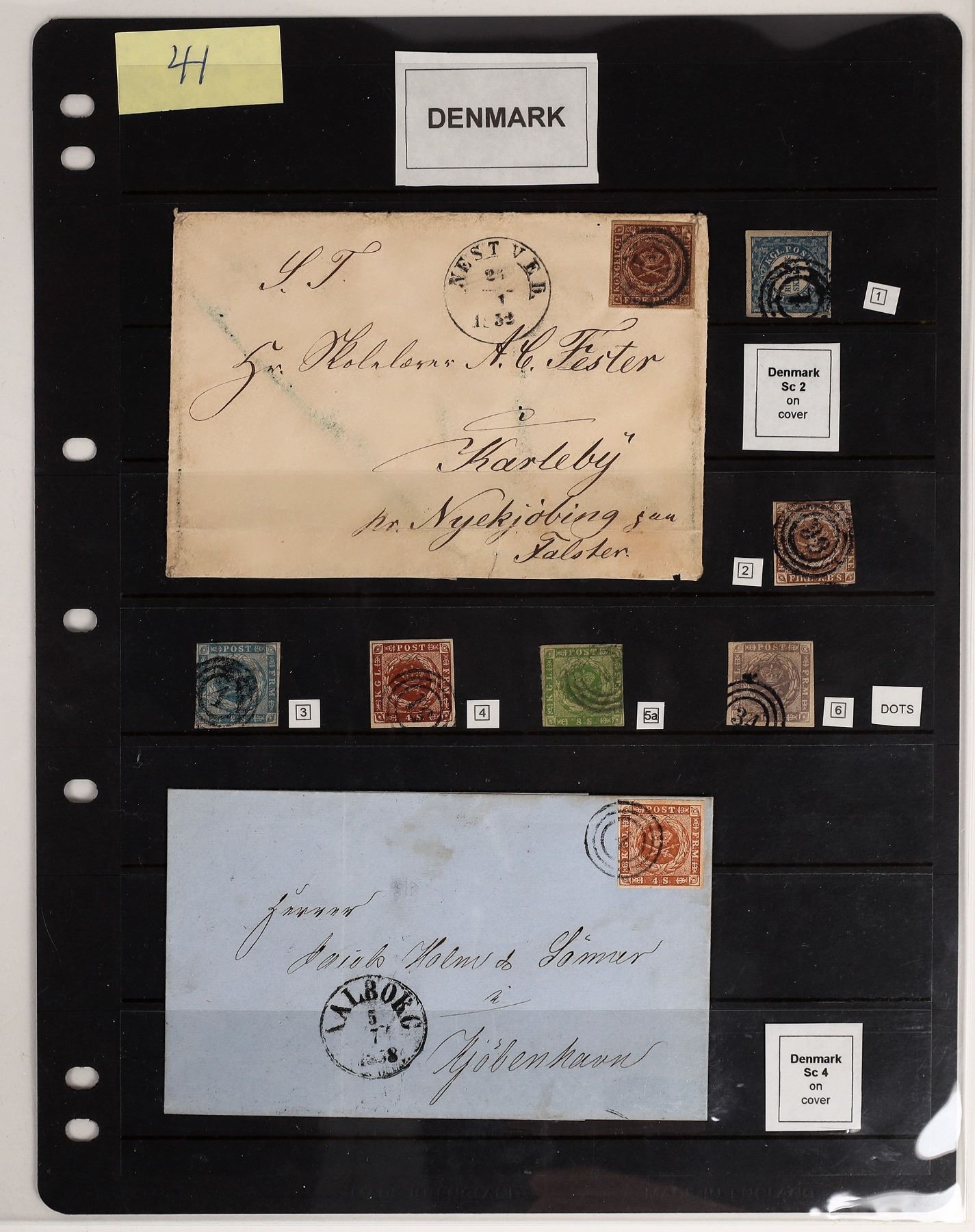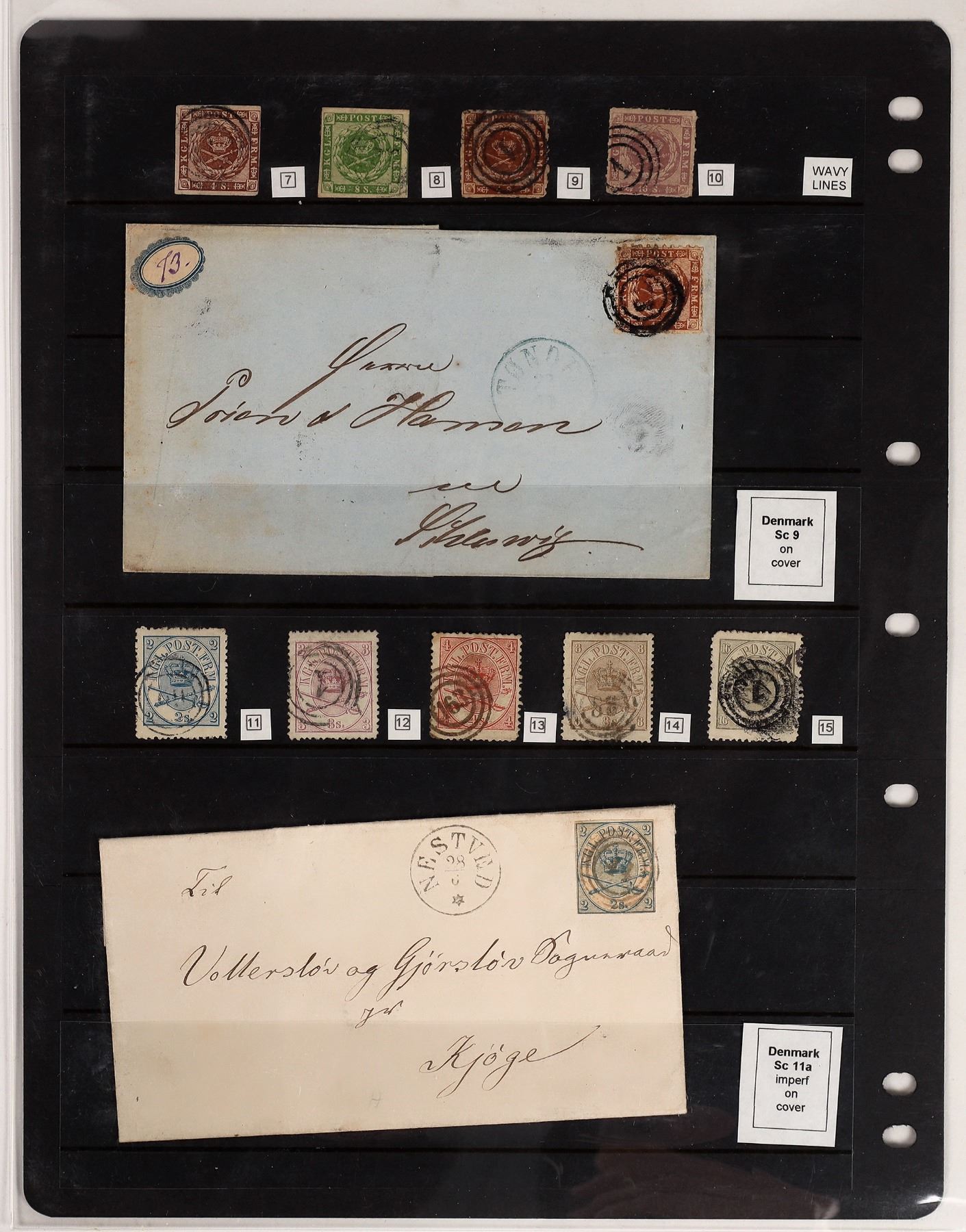 Denmark. 1851-1912 issues, a virtually complete run (Scott #1-82 complete ex #21-2), noted 1851 2rs blue (good margins, small corner thin), 1863 rouletted 16s, owner's 2005 Scott $3,600+, please see scans, also seven covers, best with 1857 8s yellow green (#5a), others with 1851 4rbs, 1854 4s, 1863 4s, 1868 2s imperf (#11a), 1864 4s, 1870 4s and 1878 8ore. Finally Danish West Indies (Scott $998 incl. 1873 4c, 1879 50c, and 1882 Ship Brokers 2c stationery to Brazil), solid group.