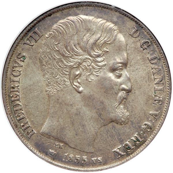 Denmark. 2 Rigisdaler, 1855-VS. Dav-77; KM-761.2. Frederick VII, 1848-1863. Bust right. Reverse: Value within wreath. Lightly toned. NGC graded MS-62.