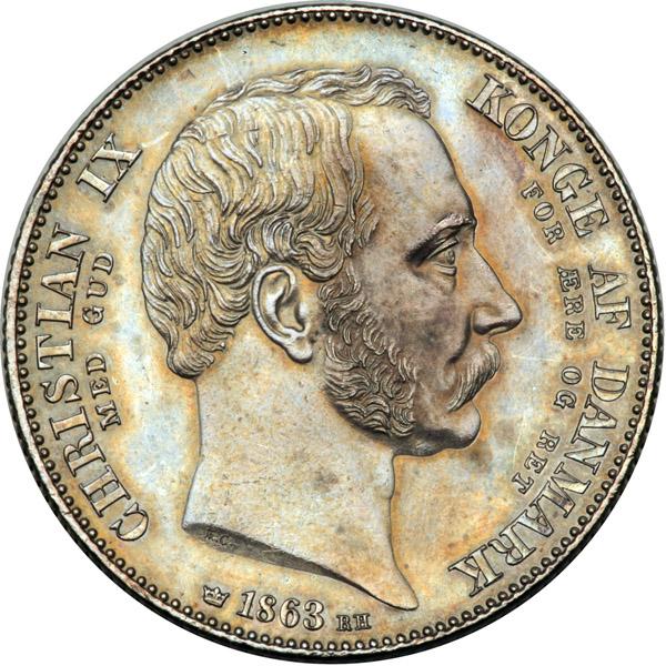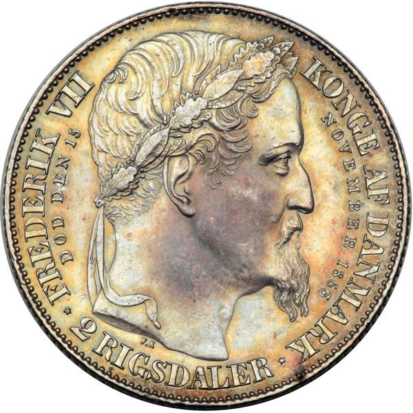 Denmark. 2 Rigsdaler, 1863. Dav-78; KM-770. Christian IX, 1863-1906. For the death of Frederik VII and the accession of Christian IX. Re-toned. Extremely Fine.