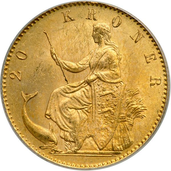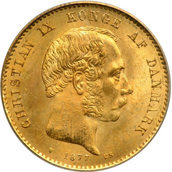 Denmark. 20 Kroner, 1877-CS. Fr-295; KM-791.1. Weight 0.2592 ounce. Christian IX, 1863-1906. PCGS graded MS-64.