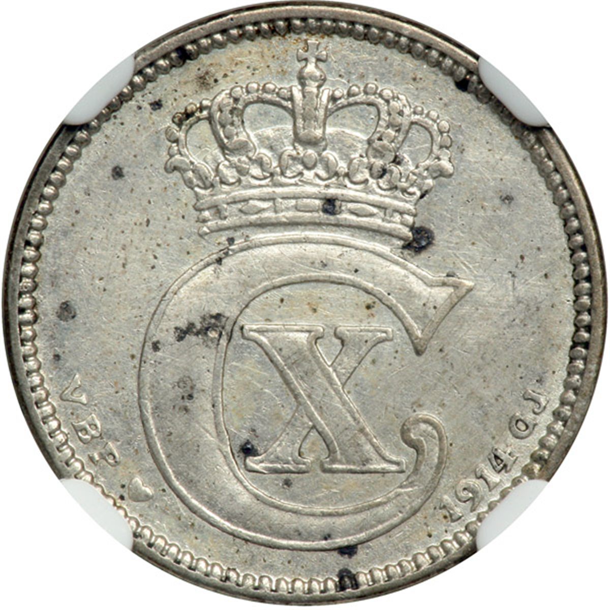 Denmark. 25 Ore, 1914-VBP GJ. KM-815.1. Christian X. Rare date. NGC graded About Uncirculated, Details (Surface Hairlines).