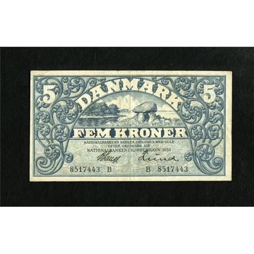 <B>Denmark</B></I> 5 Kroner 1935 Pick 25e<BR> This note depicts a Stone Age burial site. <B>Very Fine.<BR></B></I><BR><BR><b>Shipping:</b> Coins & Currency (<a target="_blank" href="http://www.heritageauctions.com/common/shipping.php">view shipping information</a>)
