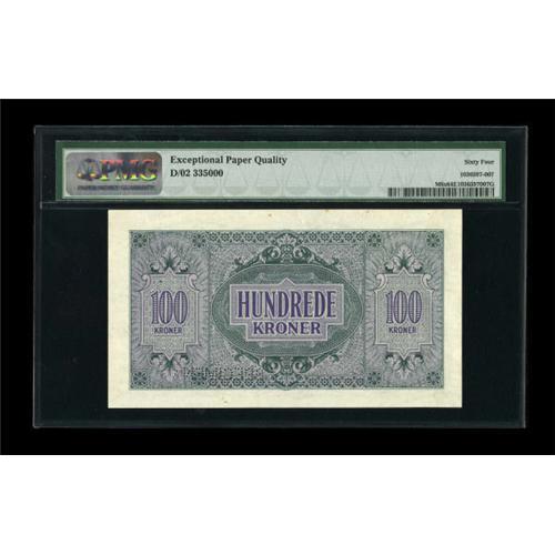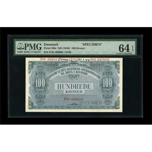 <B>Denmark</B></I> Allied Command in Denmark WWII 100 Kroner ND (1945) Pick M6s Specimen<BR> Definitely worthy of much attention, this piece features a printer's proof inscribed date of 21.3.44. Generous margins and eye catching color along with various serial numbers combine to offer the winning bidder a note which may have no rival. <B>PMG Choice Uncirculated 64 EPQ.</B></I><BR><BR><b>Shipping:</b> Coins & Currency (<a target="_blank" href="http://www.heritageauctions.com/common/shipping.php">view shipping information</a>)