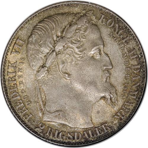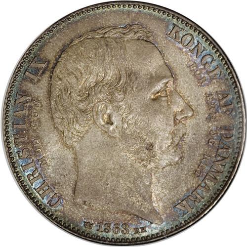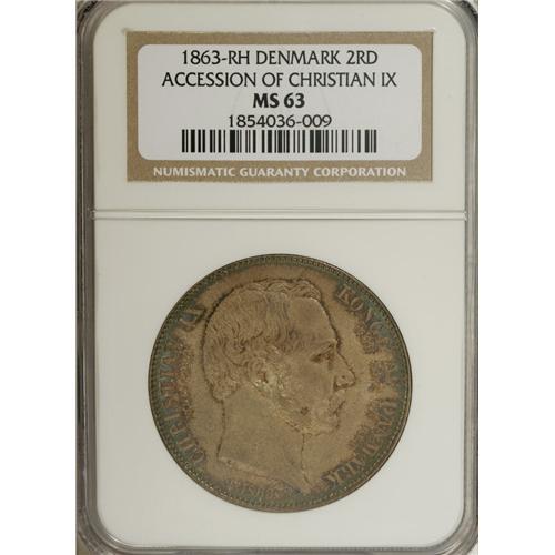 <B>Christian IX 2 Rigsdaler 1863-RH, </B></I>KM770, MS63 NGC, deep blue, green and pewter gray toning, extremely attractive. Struck to mark the accession of Christian IX and the death of Frederik VII. Clearly a premium example of this popular crown-sized type.<BR><BR><b>Shipping:</b> Coins & Currency (<a target="_blank" href="http://www.heritageauctions.com/common/shipping.php">view shipping information</a>)