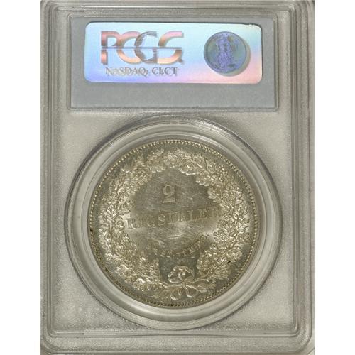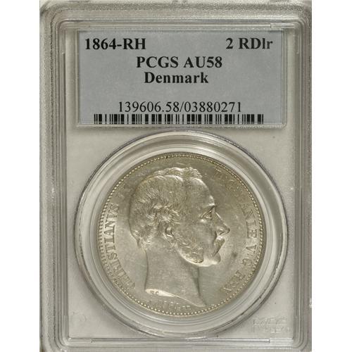 <B>Christian IX 2 Rigsdaler 1864-RH, </B></I>KM772.1, AU58 PCGS, highly lustrous, just a slight trace of wear on the high points. Very scarce type and grade.<BR><BR><b>Shipping:</b> Coins & Currency (<a target="_blank" href="http://www.heritageauctions.com/common/shipping.php">view shipping information</a>)