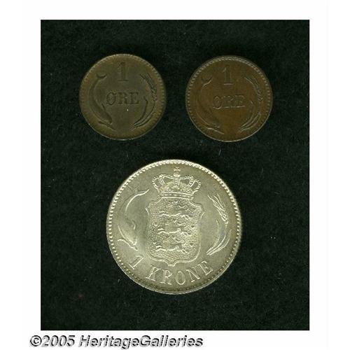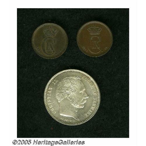 <B>Christian IX - Trio of Minors, </B></I>KM792.1 1 Ore 1878, nice XF with a trace of original luster, rare grade, and 1886, glossy brown XF, scarce grade, and KM797.1 Krone 1892, superb brilliant UNC. Three premium coins from the Danish decimal series.