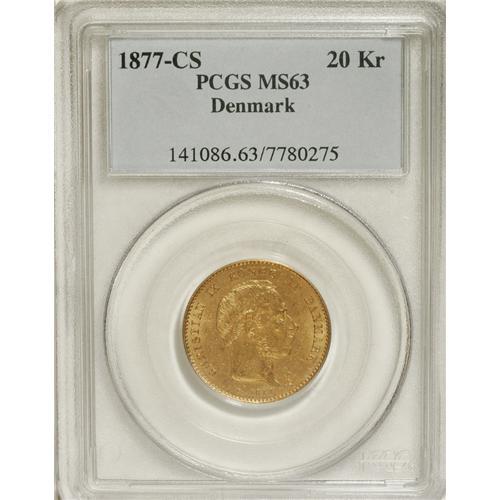 <B>Christian IX gold 20 Kroner 1877-CS, </B></I>KM791.1, MS63 PCGS, typical small contact marks and slight obverse hairlines. Scarcer date.<BR><BR><b>Shipping:</b> Coins & Currency (<a target="_blank" href="http://www.heritageauctions.com/common/shipping.php">view shipping information</a>)