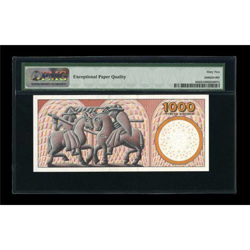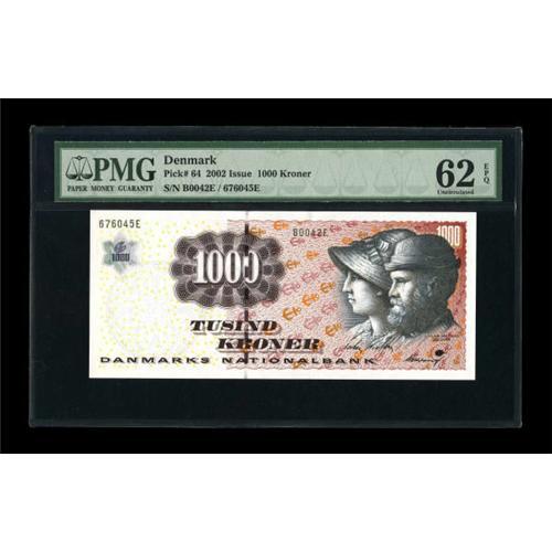 <B>Denmark</B></I> Danmarks Nationalbank 1000 Kroner 2002 Pick 64<BR> Low serial number 42 is noticed on this bright modern issue with hologram. <B>PMG Uncirculated 62 EPQ.</B></I><BR><BR><b>Shipping:</b> Coins & Currency (<a target="_blank" href="http://www.heritageauctions.com/common/shipping.php">view shipping information</a>)