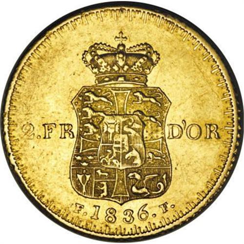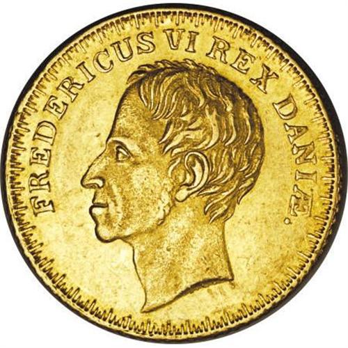 <B>Frederik VI gold 2 Frederik d'Or 1836-FF,</B></I> KM700, XF. Bright orange-gold color with considerable remaining luster. This is an extremely rare date. KM lists as Rare with no price. Hede (Hede-6) lists as RRR (2-3 pieces known). A true rarity in Danish numismatics.<BR><BR><b>Shipping:</b> Coins & Currency (<a target="_blank" href="http://www.heritageauctions.com/common/shipping.php">view shipping information</a>)