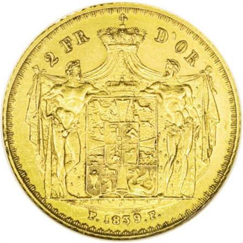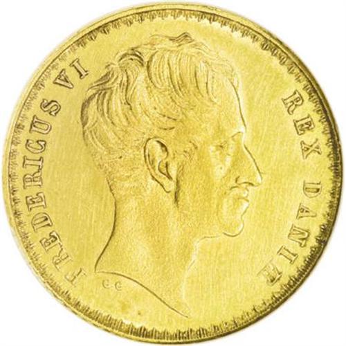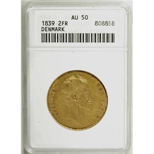 <B>Frederik VI gold 2 Frederik d'Or 1839-FF</B></I> KM713.1, Hede-5A, (RR), AU50 ANACS. Sharply struck with light hairlines, only a few minor marks and some luster remaining. A very rare issue.<BR><BR><b>Shipping:</b> Coins & Currency (<a target="_blank" href="http://www.heritageauctions.com/common/shipping.php">view shipping information</a>)