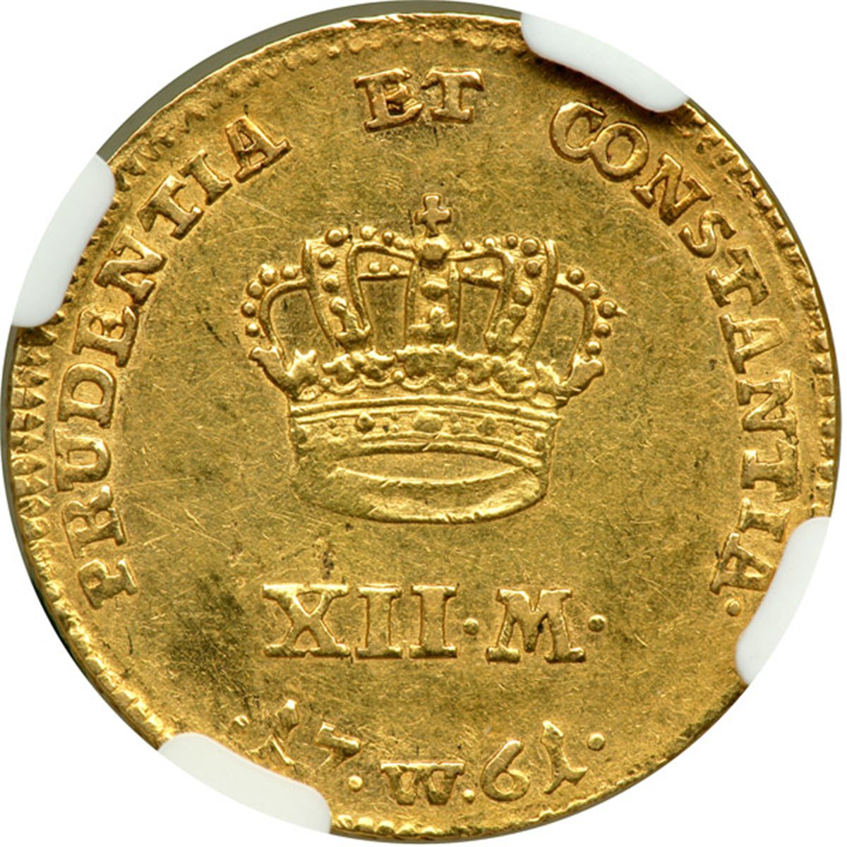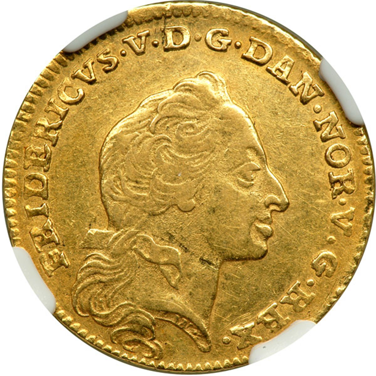 Denmark. Ducat, 1761-WW. Fr-269; KM-587.4. Frederik V, 1746-1766. Bust right. Reverse: Crown and value. NGC graded EF-45.
