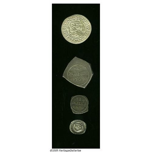 <B>Early Silver Type Quartet, </B></I>Hulpenning Bracteate of Erik of Pommerania, 1396-1439, Jesse 696, crude VF, Christian III 2 Skilling 1558 Hede 10, nice Fine, cleaned long ago, Frederik II 2 Skilling 1565 Hede 16, toned AVF, lightly porous, very scarce, and Frederik II Mark 1563 Hede 14A, VF but scratched and a large flaw or mount mark. <B>Sold as is, no return lot.</B></I>