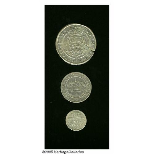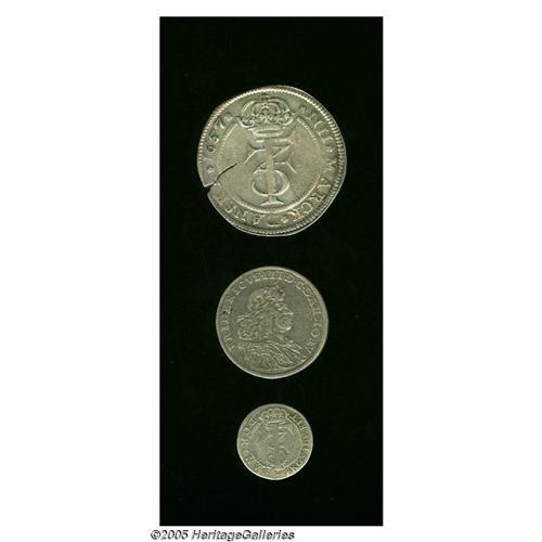 <B>Frederik III Silver Type Trio, </B></I>Hede 136A 4 Skilling 1665-GK, nice VG-F, Hede 107A 2 Mark (Half Krone) 1666-GK, toned AVF, small flan flaws as struck, and Hede 92 Krone (4 Mark) 1657, VF, large planchet crack. <B>Sold as is, no return lot.</B></I>