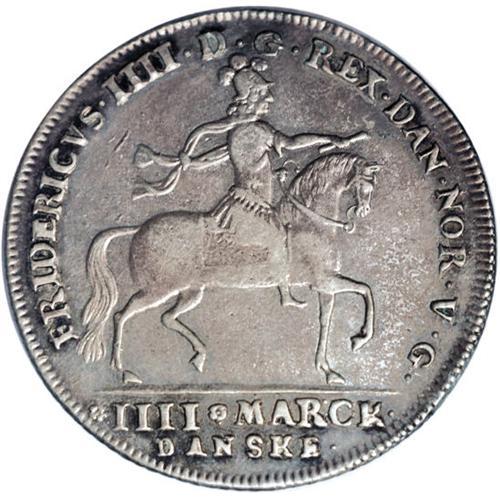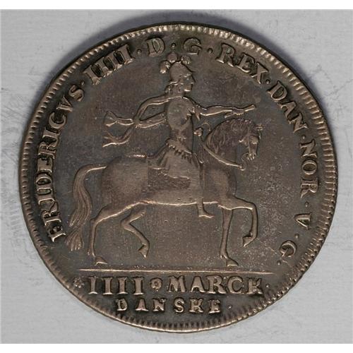 <B>Frederik IIII Krone/4 Mark 1711, </B></I>KM503, Davenport A1290, attractively toned VF, trace of mounting repair on the top rim.<BR><BR><b>Shipping:</b> Coins & Currency (<a target="_blank" href="http://www.heritageauctions.com/common/shipping.php">view shipping information</a>)