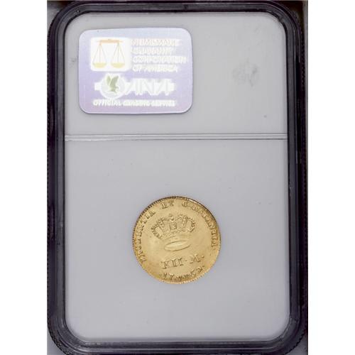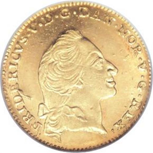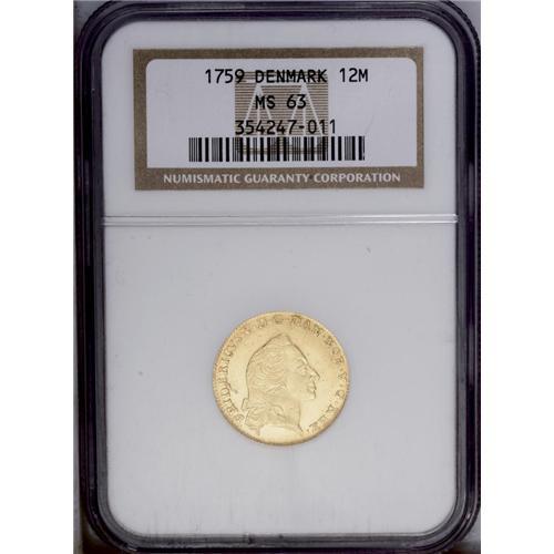 <B>Frederik V gold 12 Mark/Ducat 1759VH-W, </B></I>KM587.3, Fr-269, MS63 NGC, fully lustrous with an attractive frosted bust, very scarce this nice!<BR><BR><b>Shipping:</b> Coins & Currency (<a target="_blank" href="http://www.heritageauctions.com/common/shipping.php">view shipping information</a>)