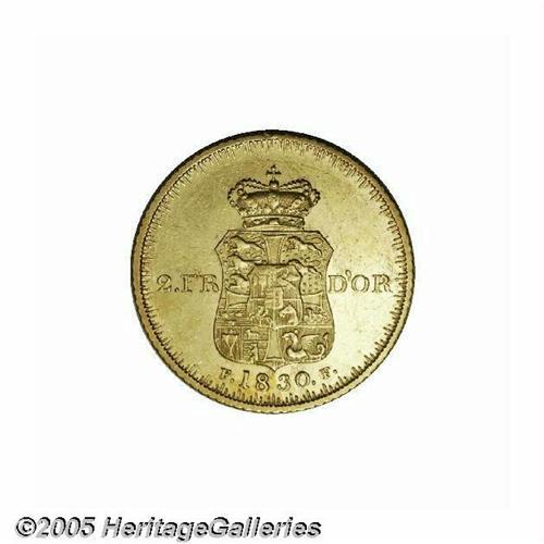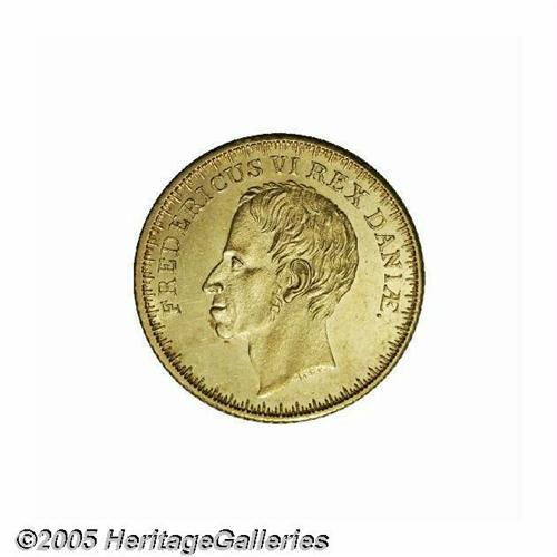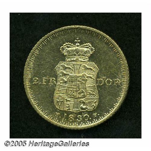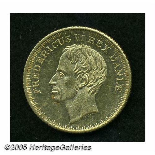 <B>Frederik VI gold 2 Frederiks d'Or 1830-FF, </B></I>KM700, choice AU, fully lustrous, light surface marks in the fields. Rare and very desirable type.