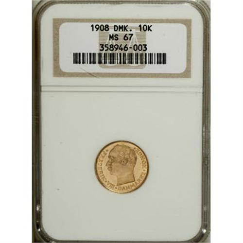 <B>Frederik VIII gold 10 Kroner 1908, </B></I>KM809, MS67 NGC, a gem example!<BR><BR><b>Shipping:</b> Coins & Currency (<a target="_blank" href="http://www.heritageauctions.com/common/shipping.php">view shipping information</a>)