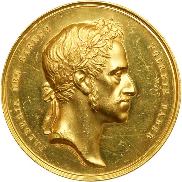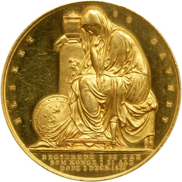 Denmark. Gold Medal, 1839. Forrer Vol. 1, 428. 44.3 mm. 69.5 grams. By Christen Christensen. Frederick VI, 1808-1839. On the Death of the King. Laureate bust of Frederick VI right. Reverse: Seated figure in mourning. Rare. NGC graded Proof 62 Cameo.