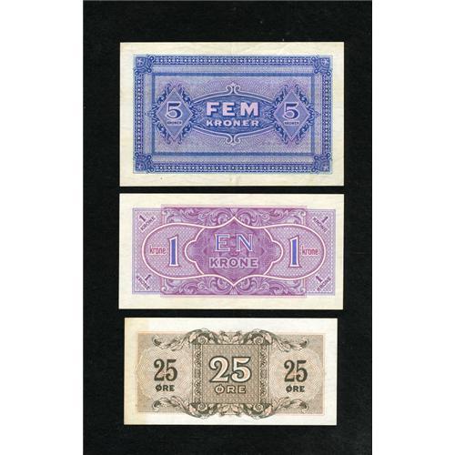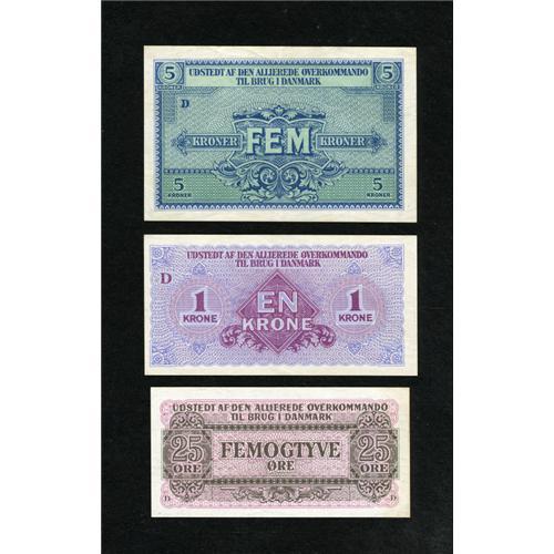 <B>Denmark Military Issues.</B></I><BR> 25 Ore; 1 Krone; 5 Krone (1945) Pick M1; M2; M3<BR>The first two notes are <B>Choice CU </B></I>and the final note is <B>XF+.<BR></B></I><BR><BR><b>Shipping:</b> Coins & Currency (<a target="_blank" href="http://www.heritageauctions.com/common/shipping.php">view shipping information</a>)