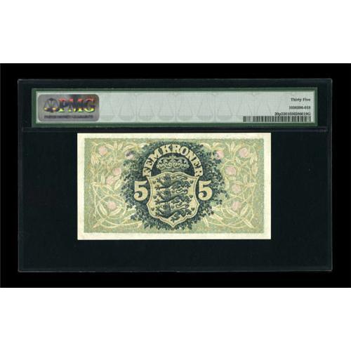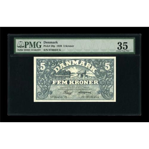 <B>Denmark</B></I> National Bank Copenhagen 5 Kroner 1929 Pick 20p<BR> The color remains quite strong despite the circulation exhibited. <B>PMG Choice Very Fine 35.</B></I><BR><BR><b>Shipping:</b> Coins & Currency (<a target="_blank" href="http://www.heritageauctions.com/common/shipping.php">view shipping information</a>)