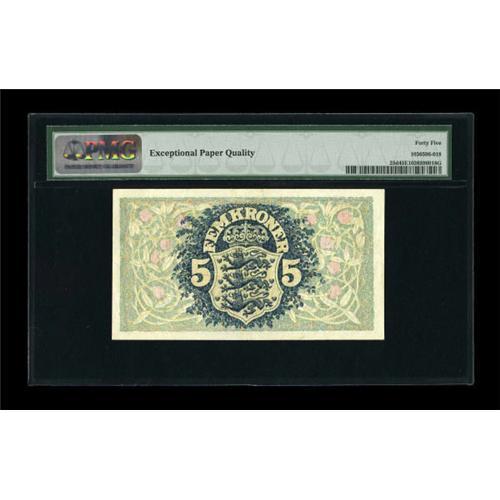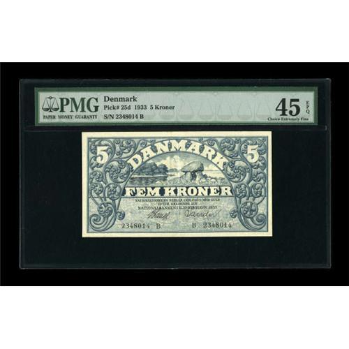 <B>Denmark</B></I> National Bank Copenhagen 5 Kroner 1933 Pick 25d<BR> This prefix "B" note sustained a change in the obligation. <B>PMG Choice Extremely Fine 45 EPQ.</B></I><BR><BR><b>Shipping:</b> Coins & Currency (<a target="_blank" href="http://www.heritageauctions.com/common/shipping.php">view shipping information</a>)