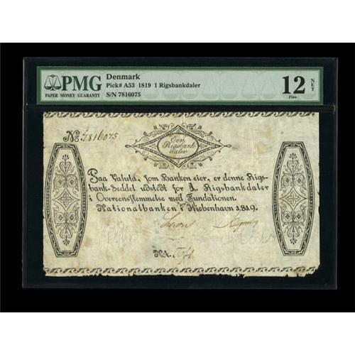 <B>Denmark</B></I> National Bank in Copenhagen 1 Rigsbankdaler 1819 Pick A53<BR> A touch of weakness in the center and a rough bottom edge account for the assigned grade on otherwise bright surfaces. <B>PMG Fine 12 Net.</B></I><BR><BR><b>Shipping:</b> Coins & Currency (<a target="_blank" href="http://www.heritageauctions.com/common/shipping.php">view shipping information</a>)