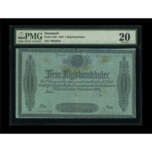 <B>Denmark</B></I> National Bank of Copenhagen 5 Rigsbankdaler 1835 Pick A58<BR> This scarcer issue offers no pricing info above fine. The color remains deep and a few margin splits are noted along the center fold. <B>PMG Very Fine 20.</B></I><BR><BR><b>Shipping:</b> Coins & Currency (<a target="_blank" href="http://www.heritageauctions.com/common/shipping.php">view shipping information</a>)