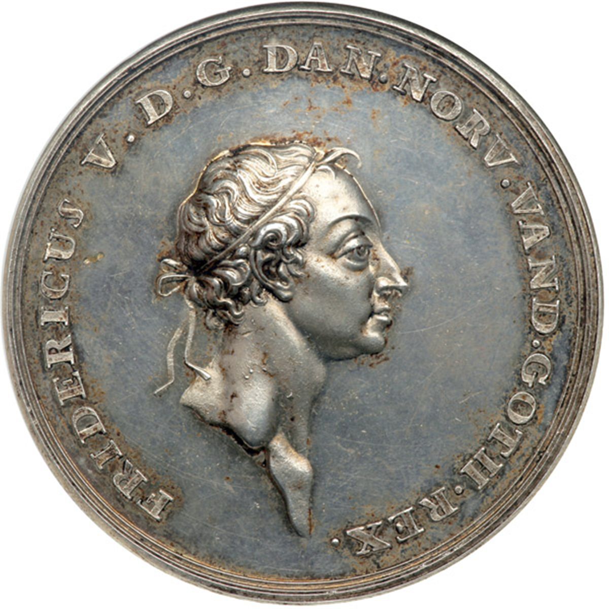 Denmark. Royal Academy Prize Medal, ND(c.1800). Galster-451; Forrer II, 259. Silver. 48.5 mm. by Pietro Leonardo Gianelli. Frederik V bust right. Reverse: Palm tree growing from rock, "ALLICIENDO" above, exergue note the issuer, the Royal Academy of Painting, Sculpture and architecture. Scarce. NGC graded MS-64.
