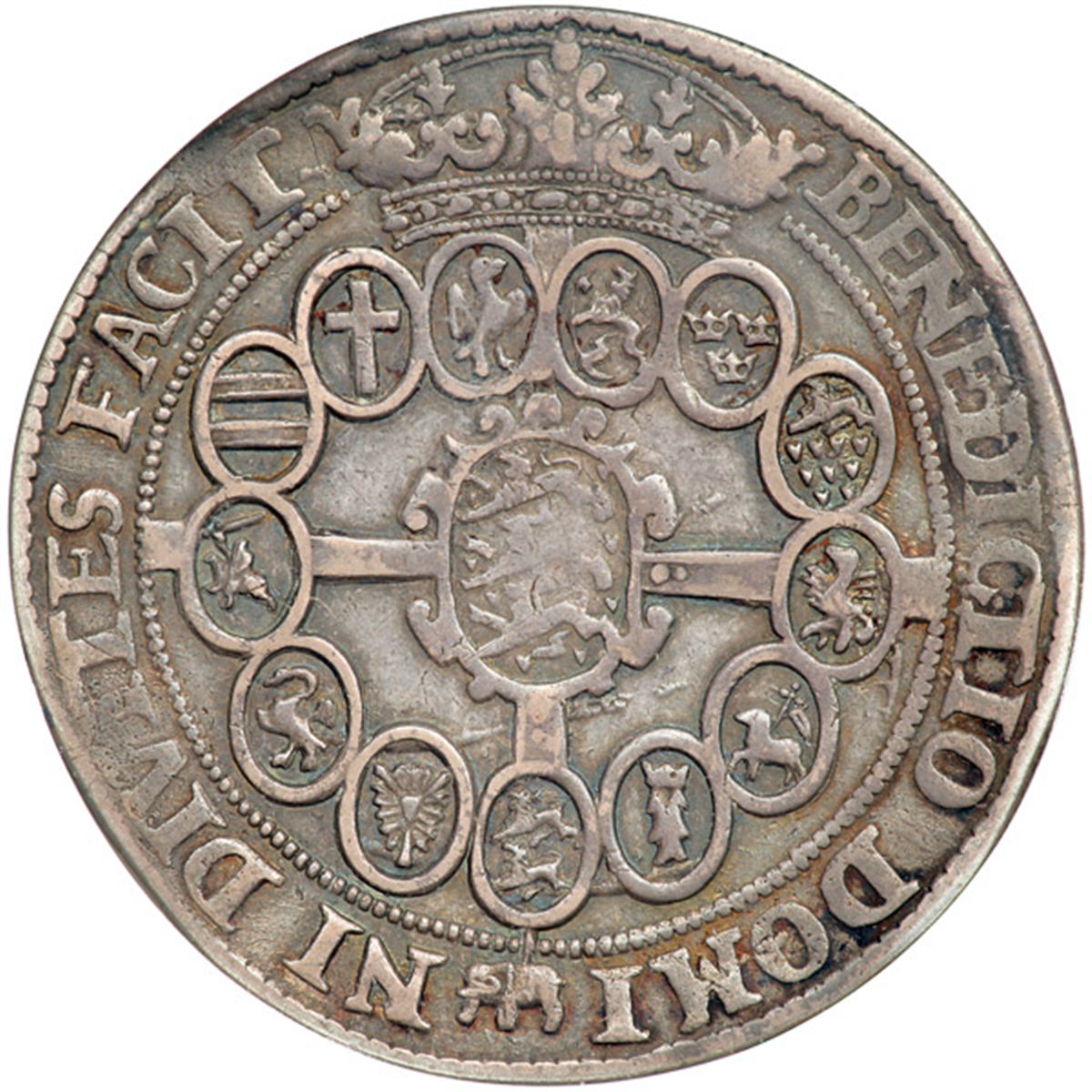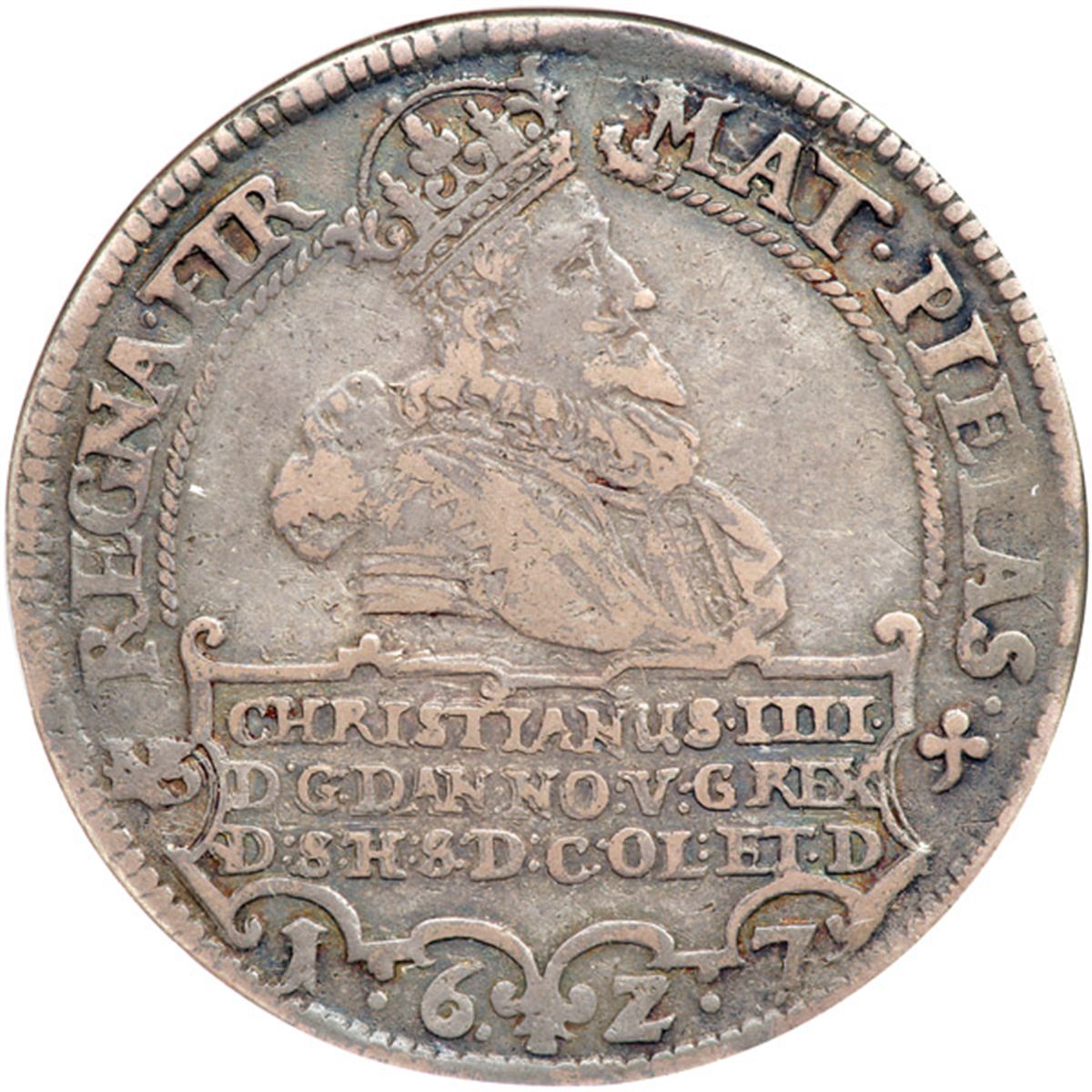 Denmark. Speciedaler, 1627-NS. Dav-3524; Hede-55; KM-101. Christian IV, 1588-1648. Crowned half bust right. Reverse: Crowne oval arms on cross. Toned. NGC graded VF-25.