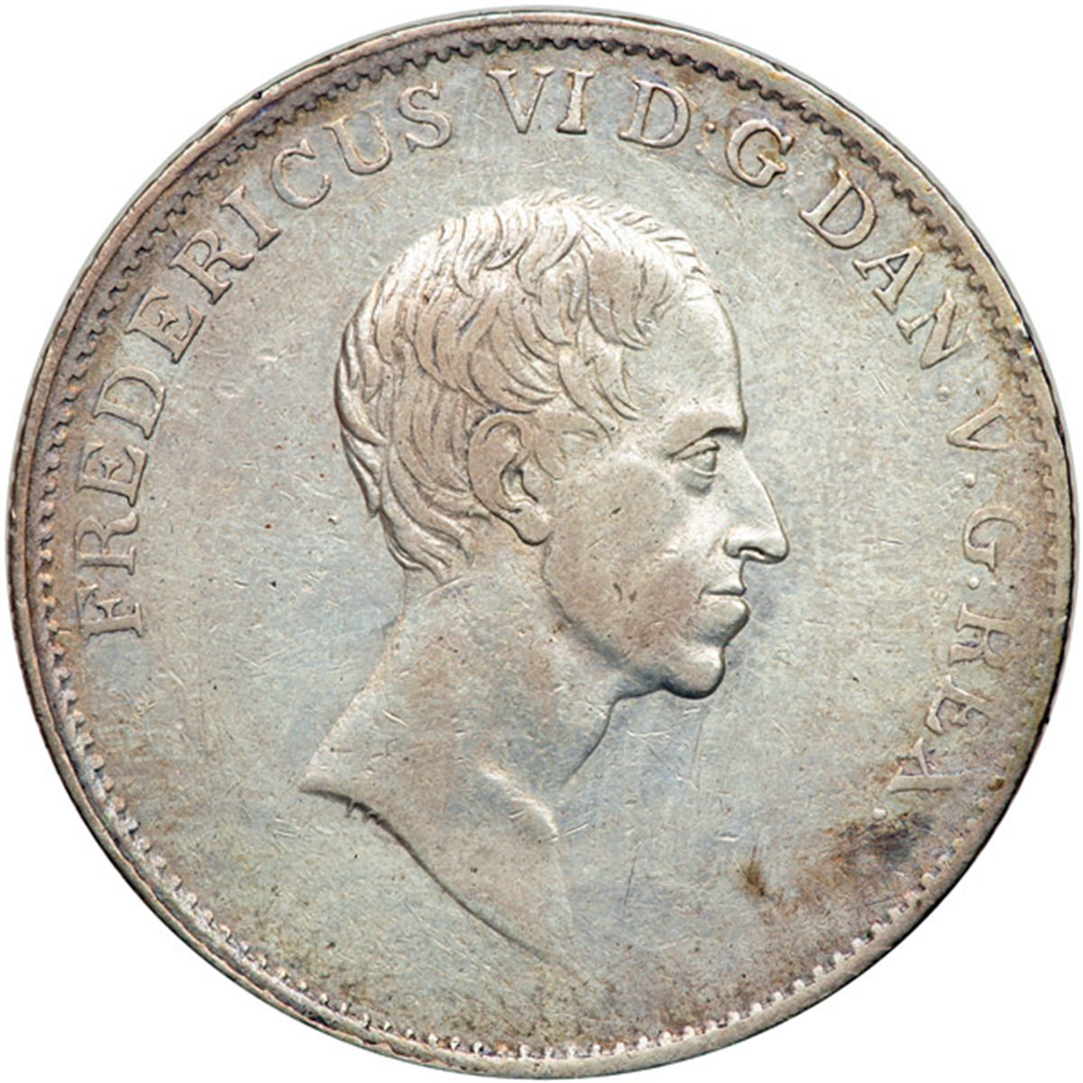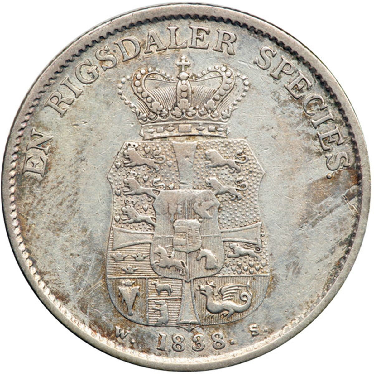 Denmark. Speciedaler, 1838-WS. Dav-73; KM-695.4. Frederik VI, 1808-1839. Head right. Reverse: Crowned arms. Very Fine.