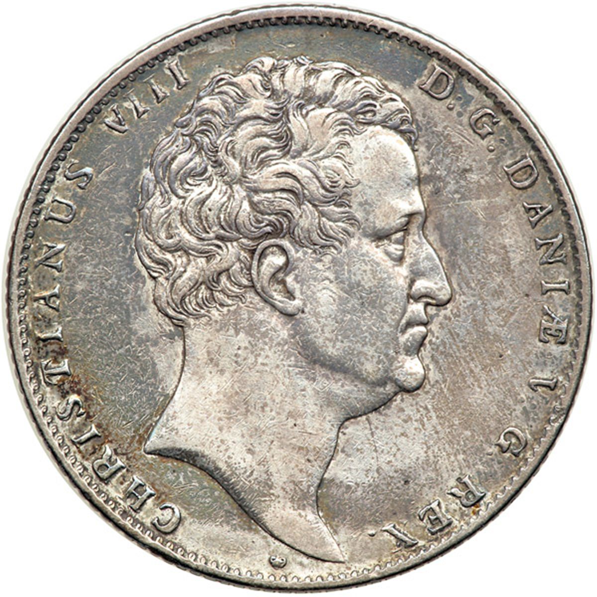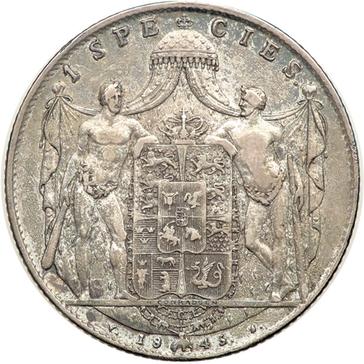 Denmark. Speciedaler, 1845-VS. Dav-74; KM-720.3. Christian VIII. Head right. Reverse: Crowned arms supported by wild men. Toned. Very Fine.