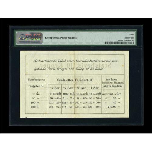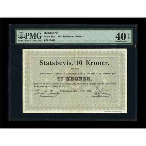 <B>Denmark </B></I>State Treasury Note 10 Kroner 1914 Pick 16a <BR> This Series 1 example retains much eye appeal despite a couple of age spots. <B>PMG Extremely Fine 40 EPQ.</B></I><BR><BR><b>Shipping:</b> Coins & Currency (<a target="_blank" href="http://www.heritageauctions.com/common/shipping.php">view shipping information</a>)
