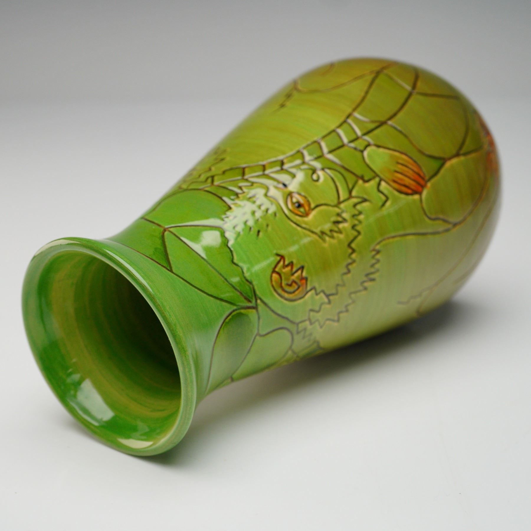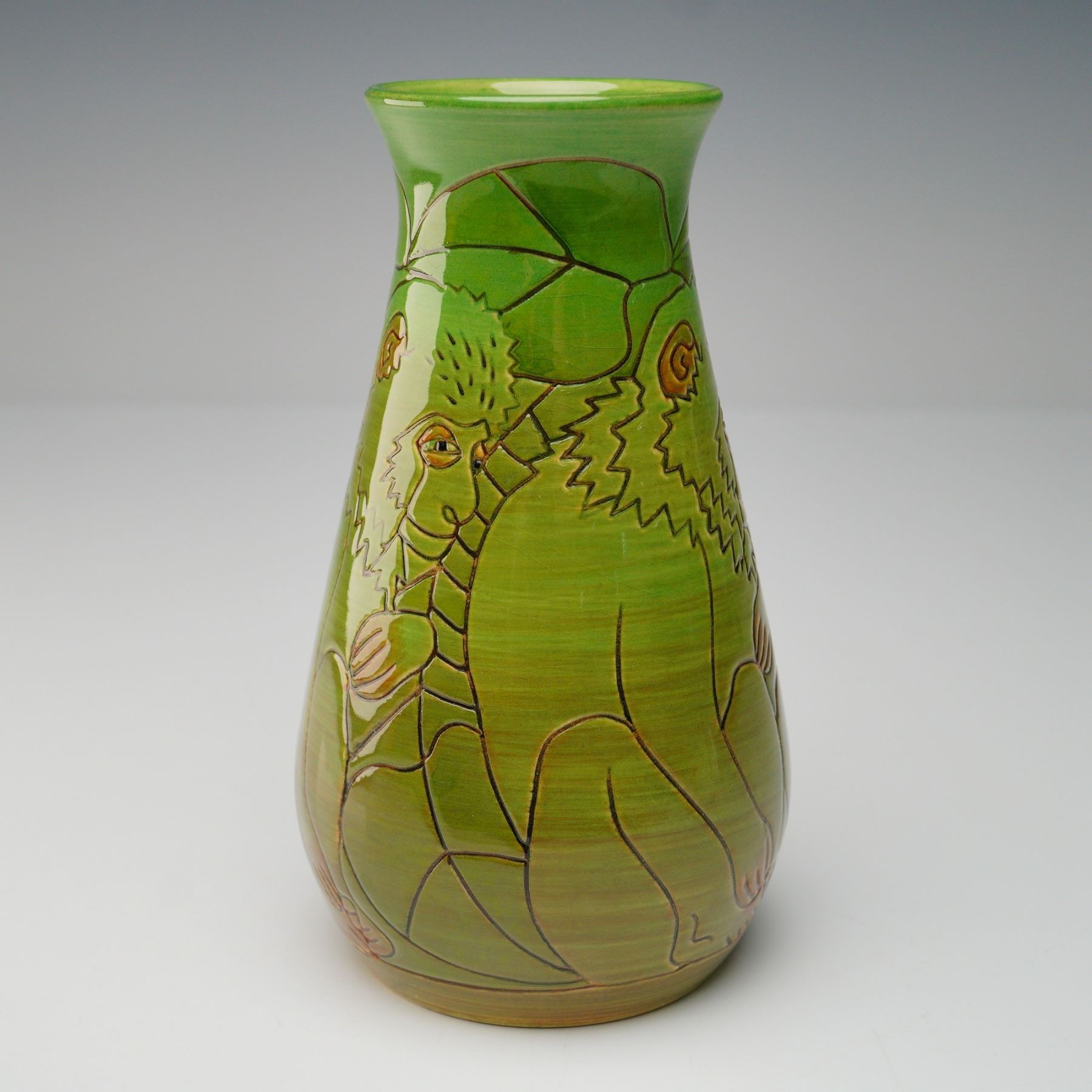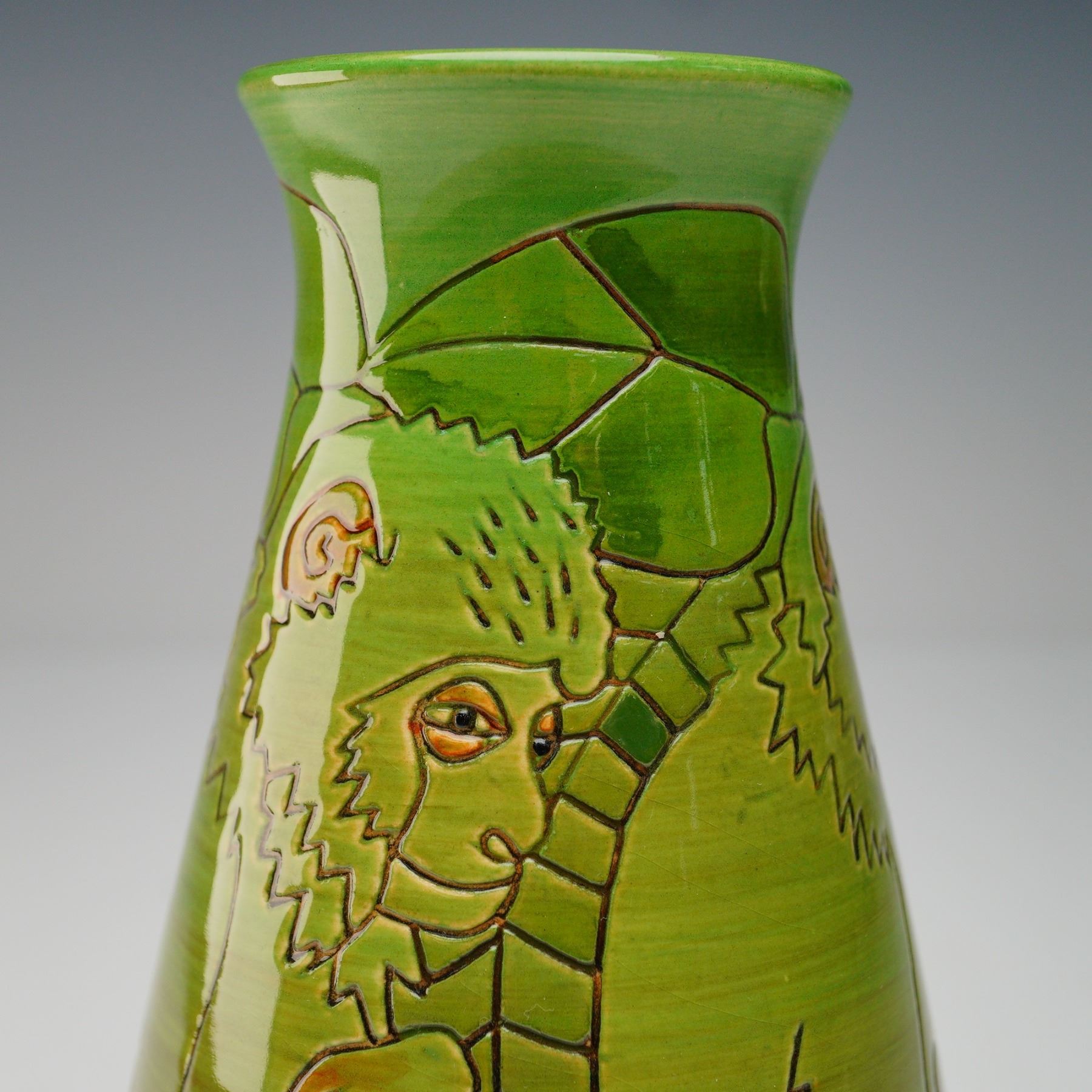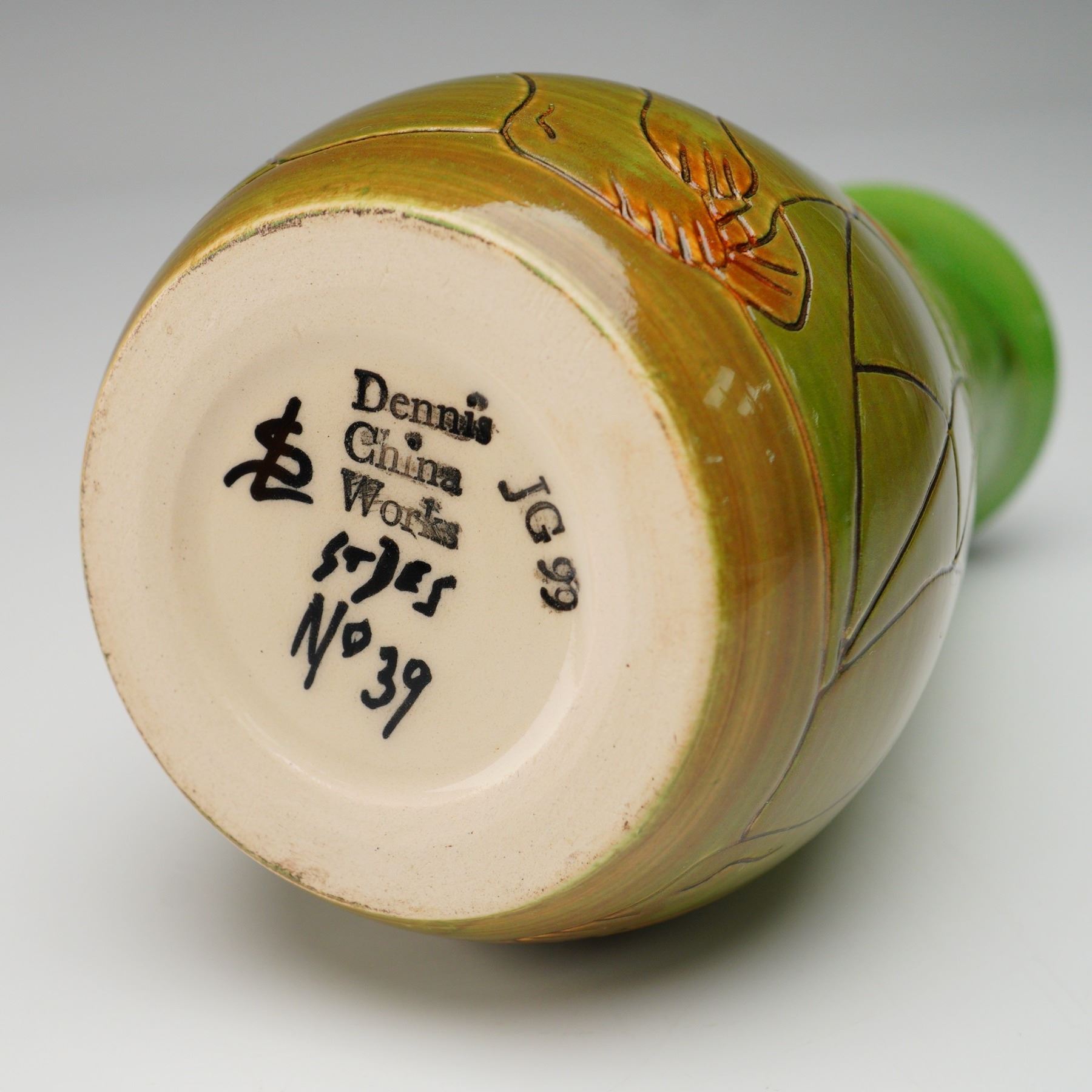 Dennis China Works studio art vase featuring an incised and hand-painted design of a monkey climbing among stylized foliage in green and earthy tones. The vase has a tapering cylindrical form with a flared rim. Designed by JG and produced in 1999, this piece is part of a limited edition series numbered 39. The base is marked Dennis China Works, JG 99, with additional painted marks including the edition number. Measures 5.75"H.