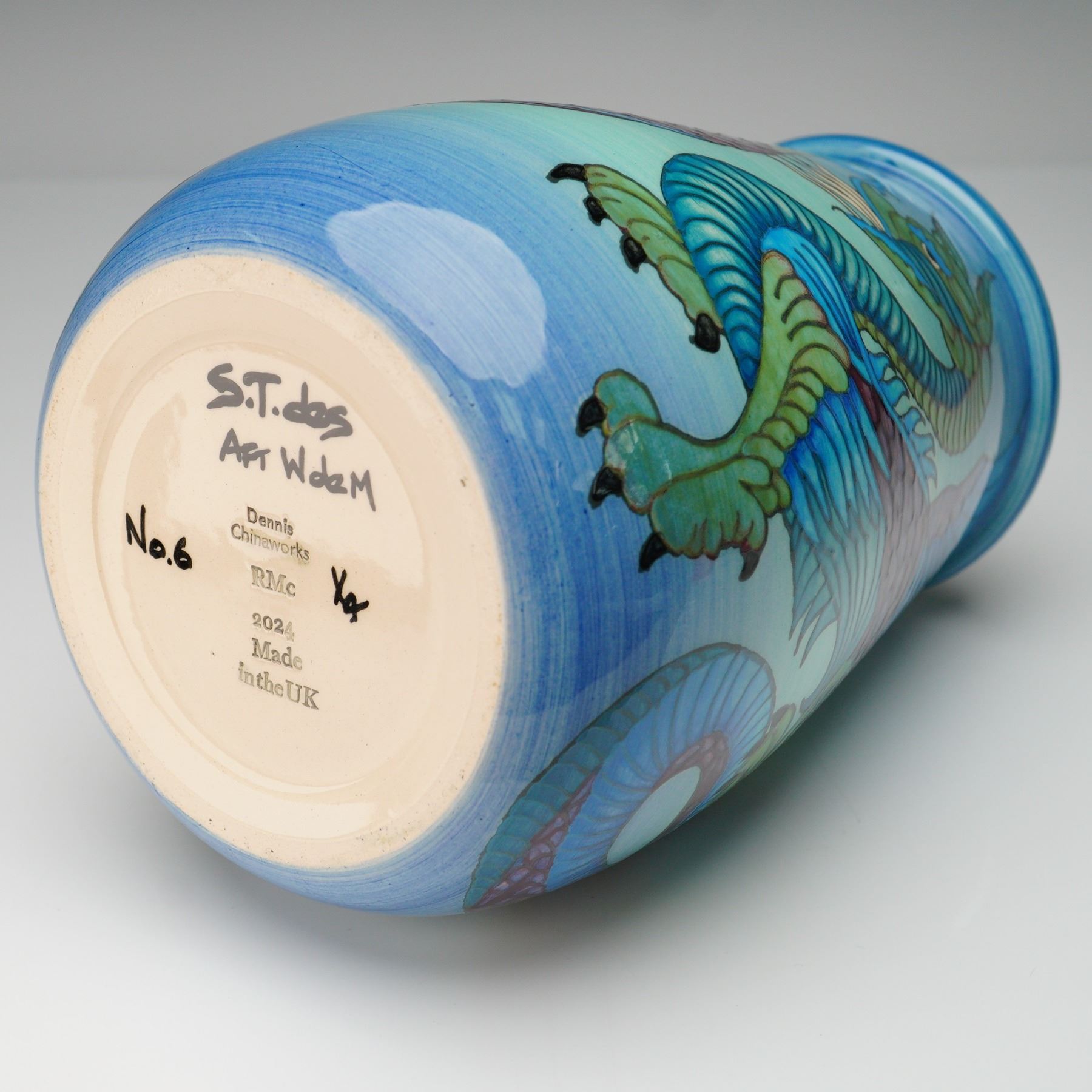 Handcrafted ceramic vase created by Dennis Chinaworks in 2024, designed by Sally Tuffin after the decorative ceramic motifs of 19th-century English designer William De Morgan. This limited edition piece features a vividly stylized dragon rendered in shades of green, blue, and purple with intricate hand-slip-trailed and hand-painted detailing against a gradient blue ground. The dragon's serpentine form winds around the body of the vase, showcasing finely articulated scales, wings, and claws in rich coloration with dark outlines, exemplifying the influence of De Morgan's fantastical beasts. The vase has a flared rim and smooth glazed interior. The underside is inscribed with multiple marks: "S.T. des" (indicating design by Sally Tuffin), "AFT WdM" (After William De Morgan), and "RMC 2024" (likely referring to a studio artist or assistant). It also bears the Dennis Chinaworks mark, edition number "No.6".
