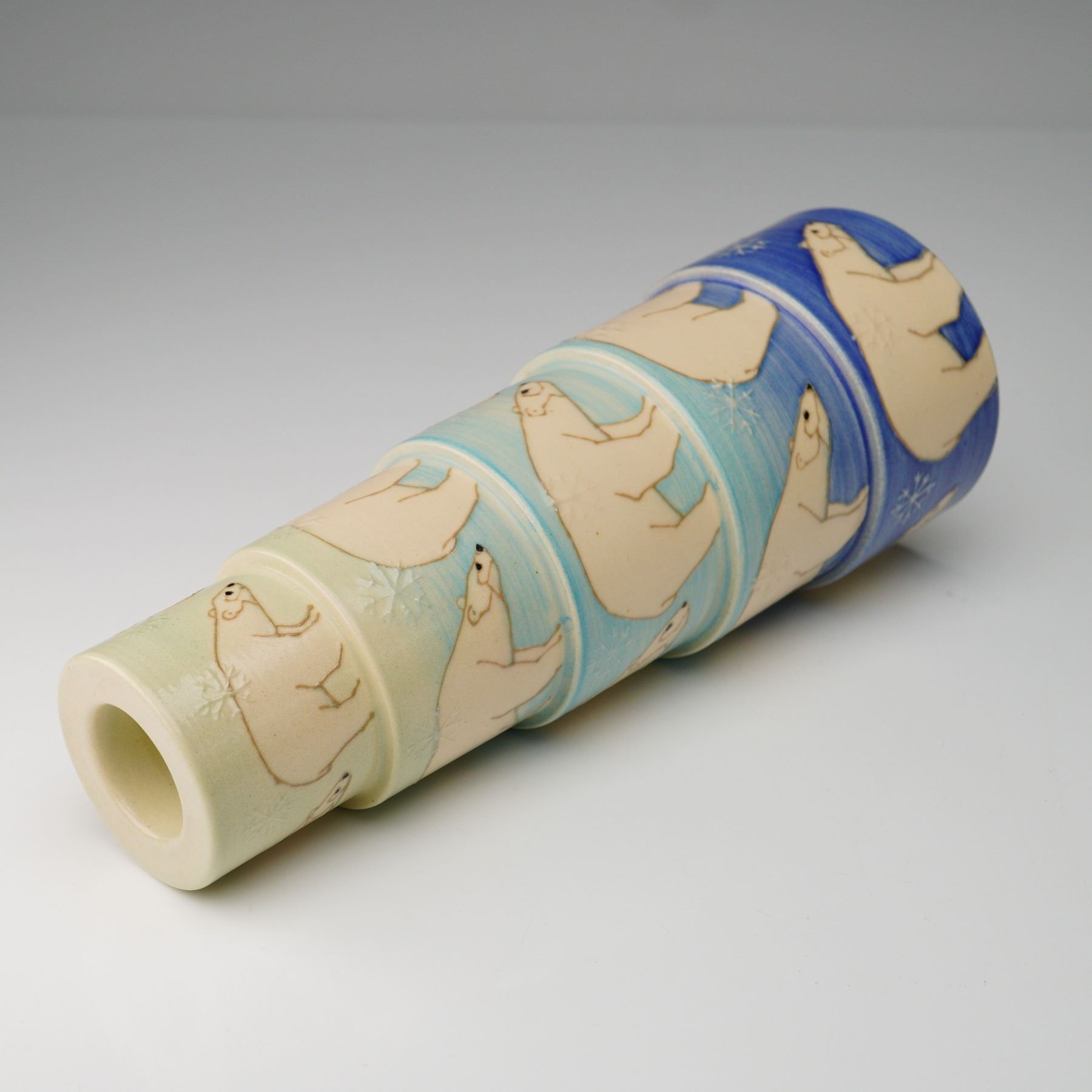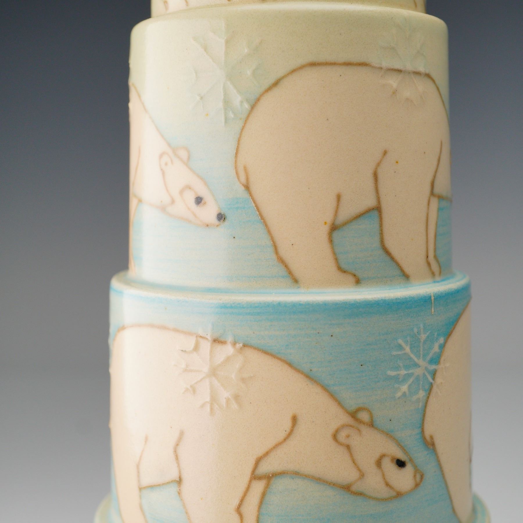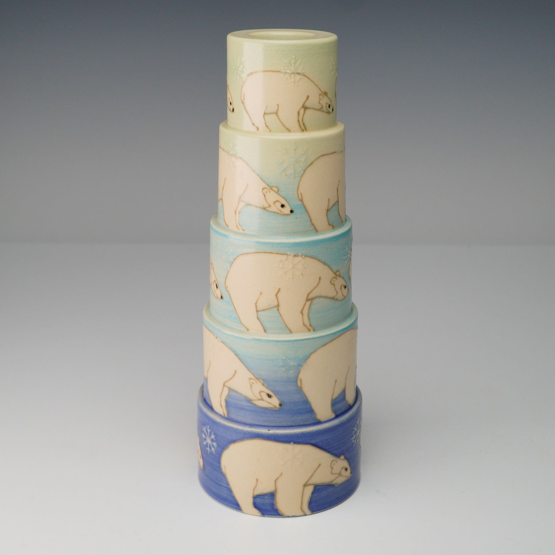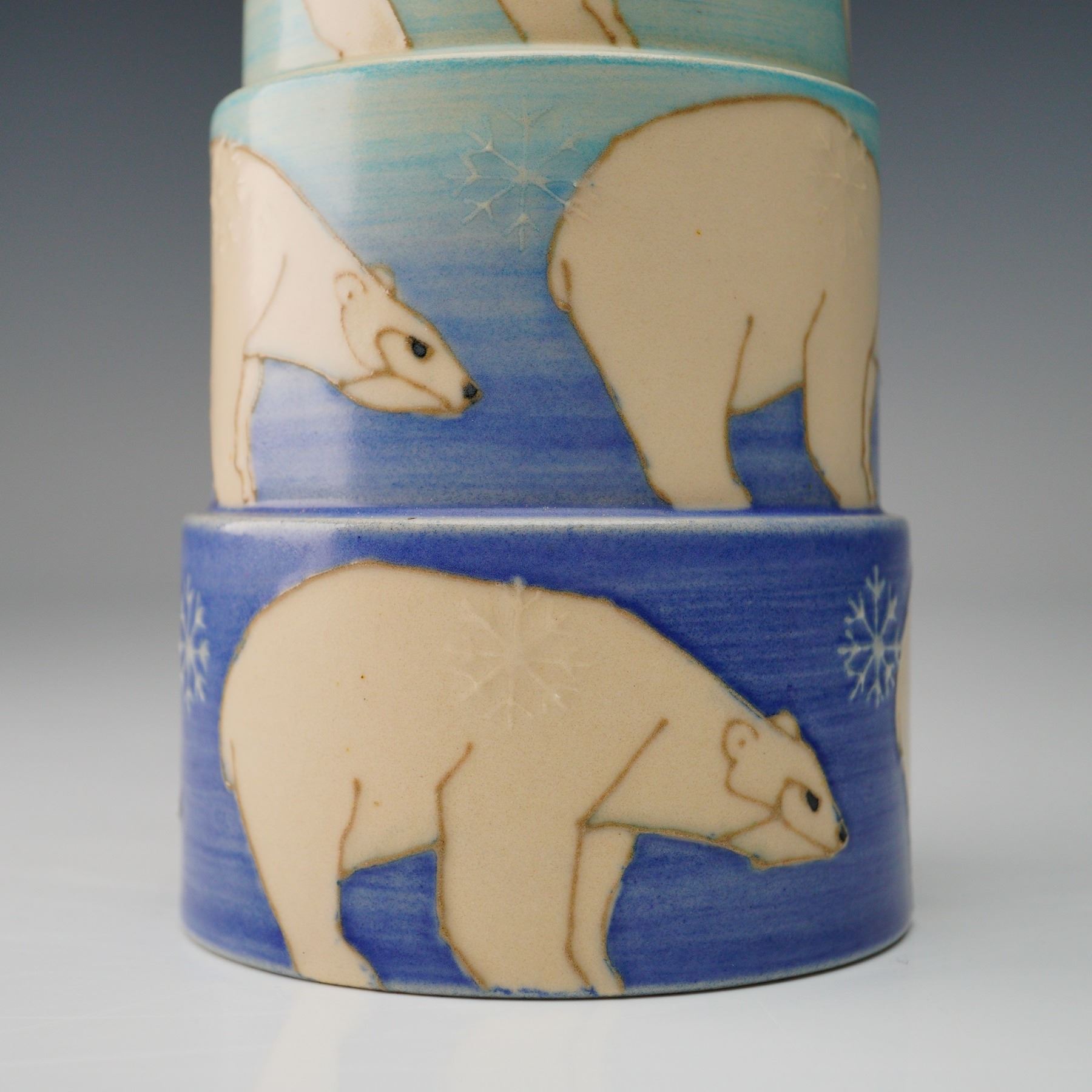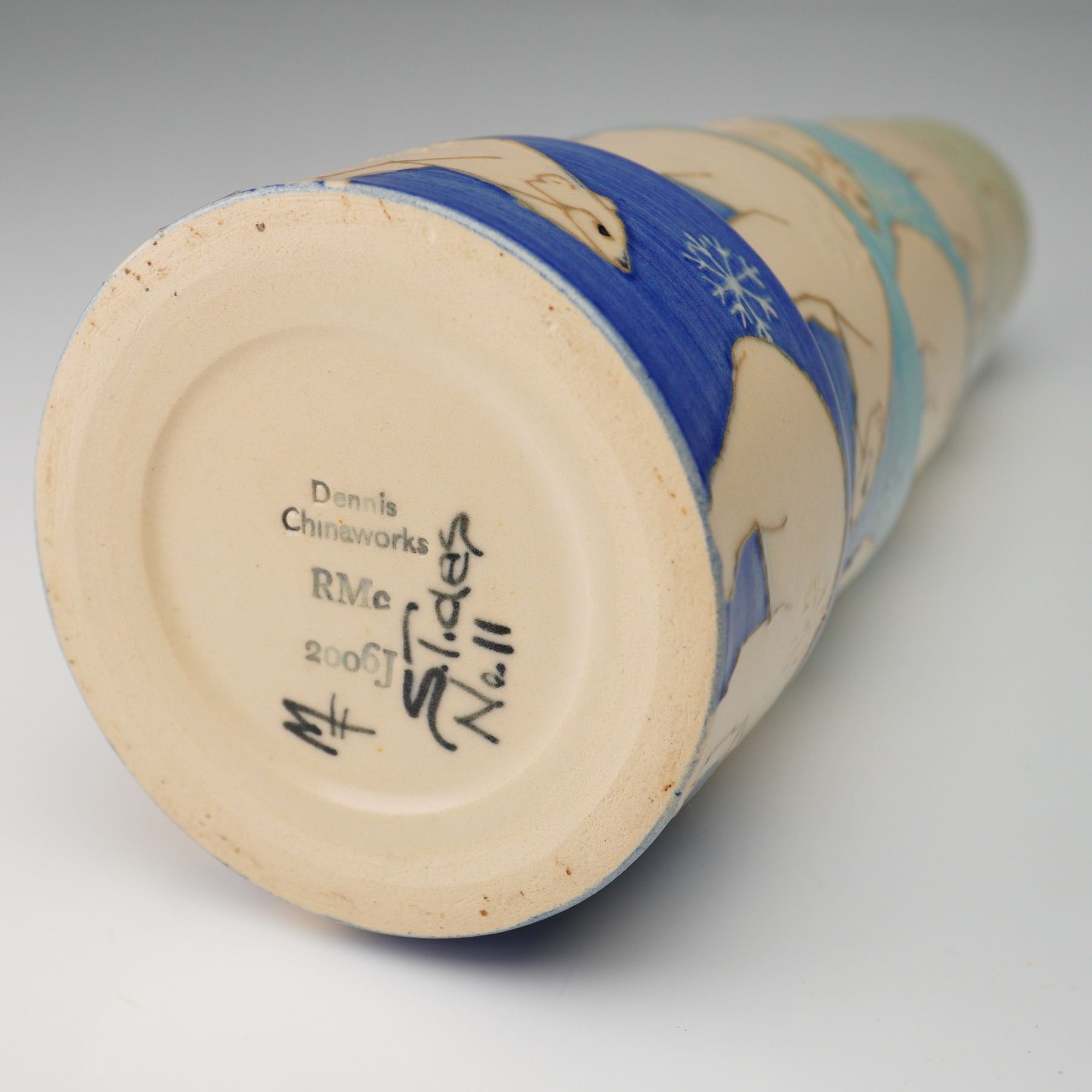 This cylindrical form features a carved and vividly glazed surface with a continuous design of stylized polar bears set against a gradient background transitioning from light green to deep blue. The bears are depicted in a repeating walking stance, interspersed with embossed snowflake motifs around their forms. The base is fully marked: "Dennis Chinaworks," with decorator's and designer's initials. Marked "No. 11."