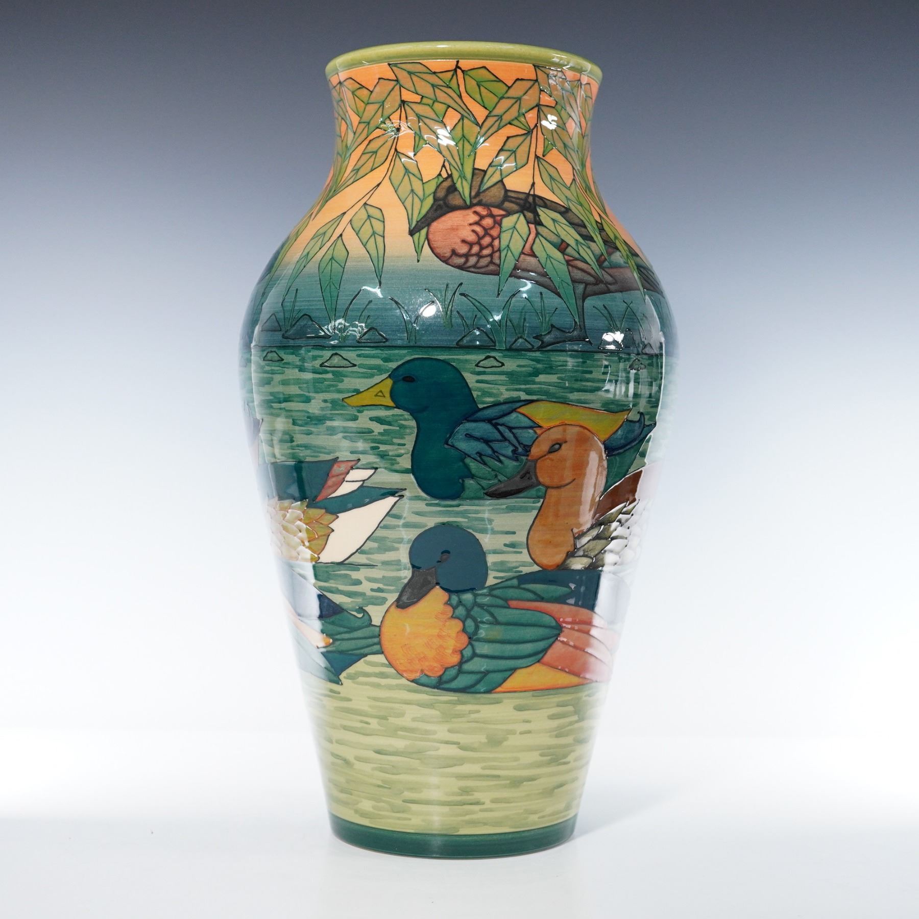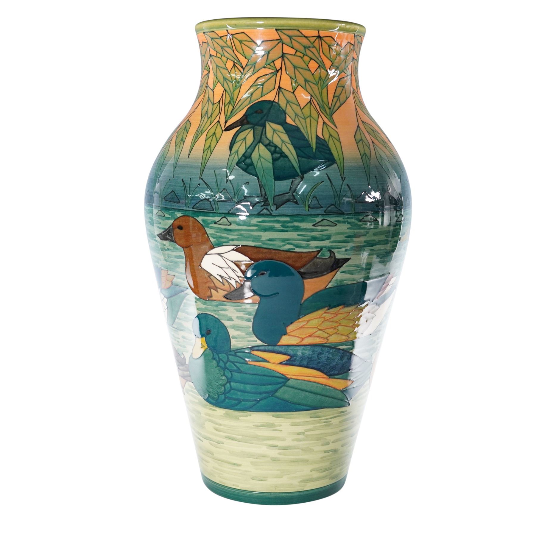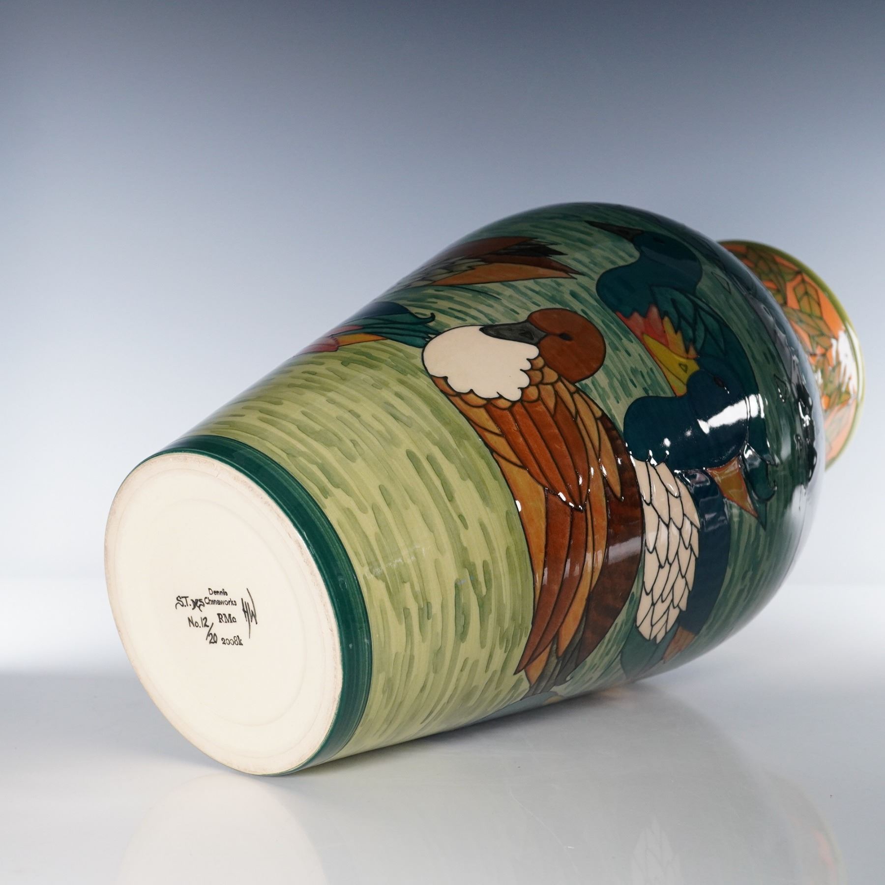 Handcrafted vase from Dennis Chinaworks, designed by Sally Tuffin and potted by Rory McLeod. This limited edition piece is numbered 12 of 20 and dated 2008. The vase features a continuous panoramic depiction of a duck pond scene, rendered in vibrant, saturated glazes with intricate hand-drawn detailing. The imagery includes mallard ducks and other waterfowl swimming in green-toned water, surrounded by reeds and leafy vegetation with a tonal gradient transitioning from an earthy green base to a warm sunset orange near the top. The design is expertly segmented using black linework, emphasizing the stained-glass-like quality of the composition. The vessel has a rounded shoulder tapering toward a narrow foot with a gently flared rim in olive green glaze. The base is inscribed with "S.T. DES", "Dennis Chinaworks", "RMc", the edition number "No. 12/20", and the date "2008k".