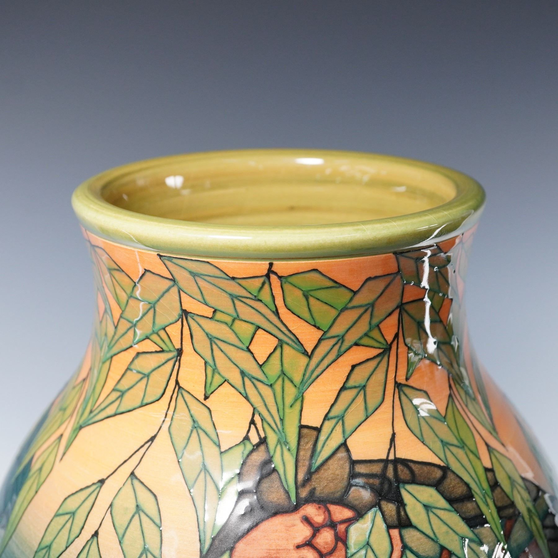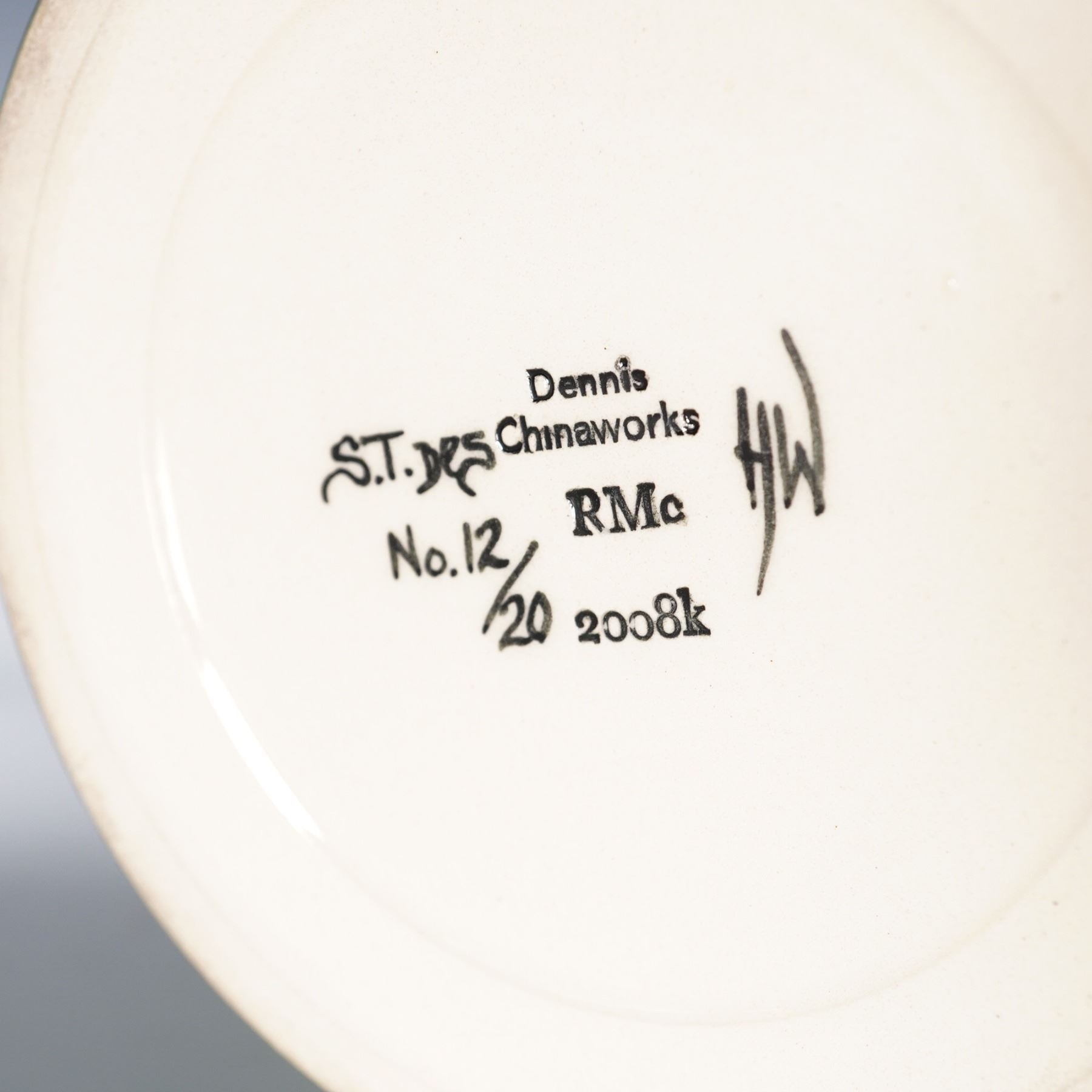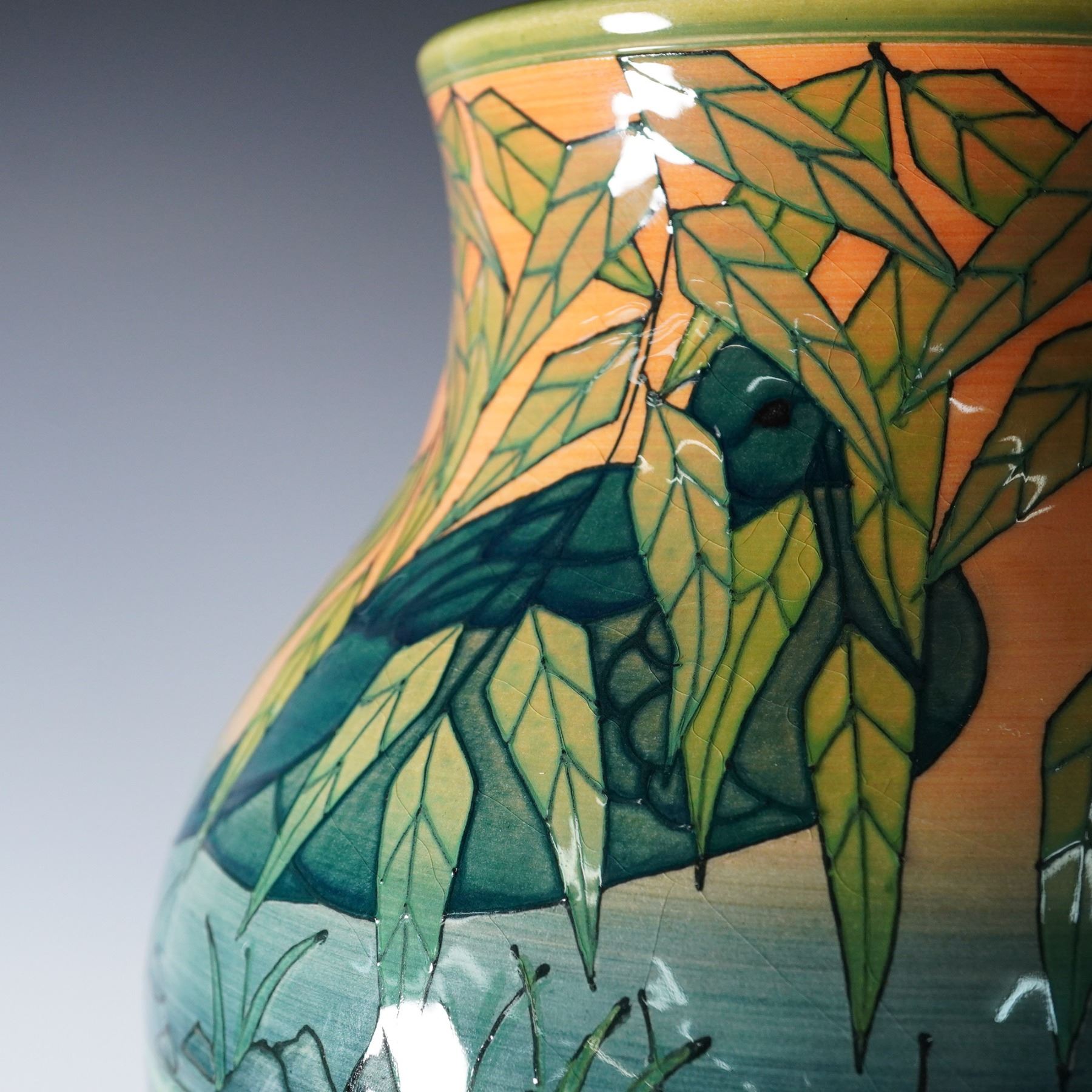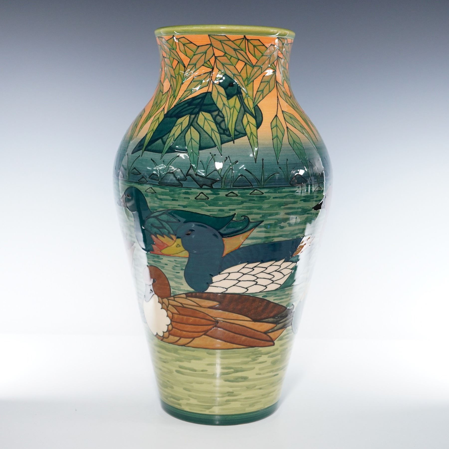 Handcrafted vase from Dennis Chinaworks, designed by Sally Tuffin and potted by Rory McLeod. This limited edition piece is numbered 12 of 20 and dated 2008. The vase features a continuous panoramic depiction of a duck pond scene, rendered in vibrant, saturated glazes with intricate hand-drawn detailing. The imagery includes mallard ducks and other waterfowl swimming in green-toned water, surrounded by reeds and leafy vegetation with a tonal gradient transitioning from an earthy green base to a warm sunset orange near the top. The design is expertly segmented using black linework, emphasizing the stained-glass-like quality of the composition. The vessel has a rounded shoulder tapering toward a narrow foot with a gently flared rim in olive green glaze. The base is inscribed with "S.T. DES", "Dennis Chinaworks", "RMc", the edition number "No. 12/20", and the date "2008k".