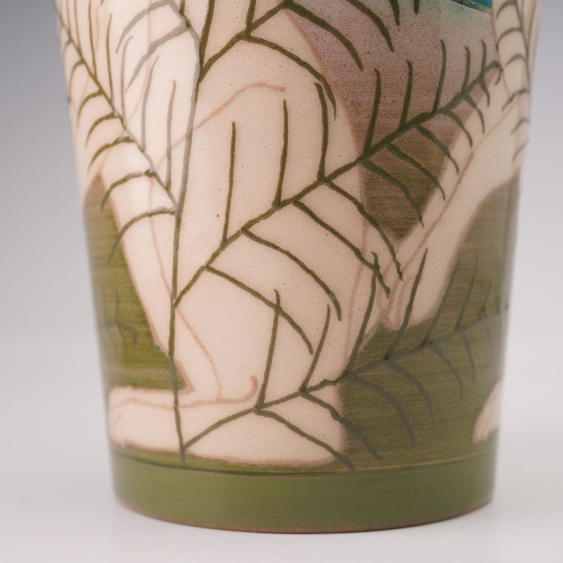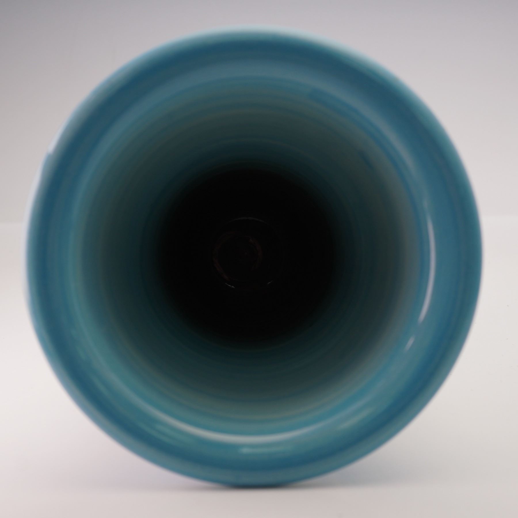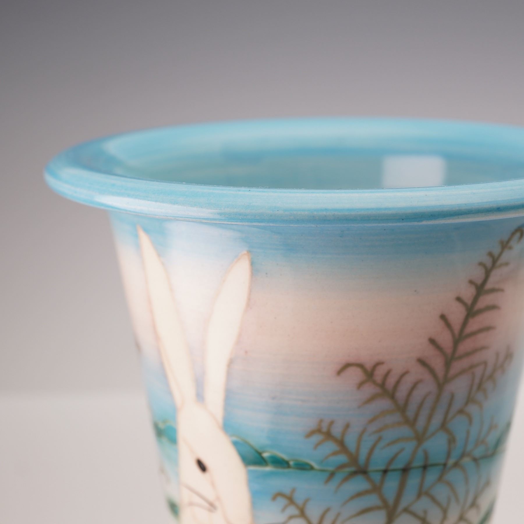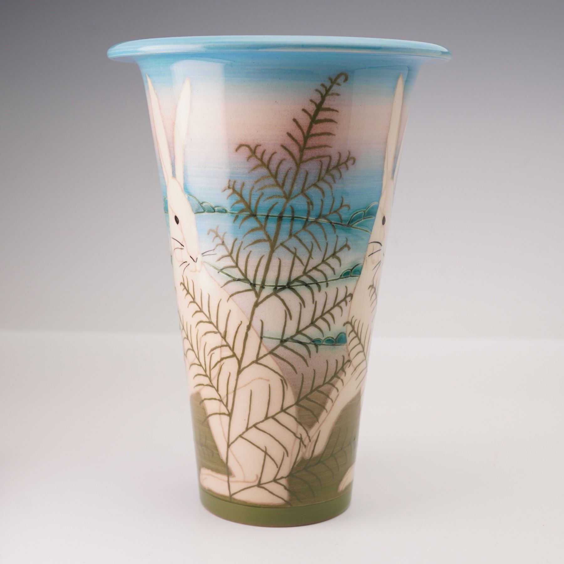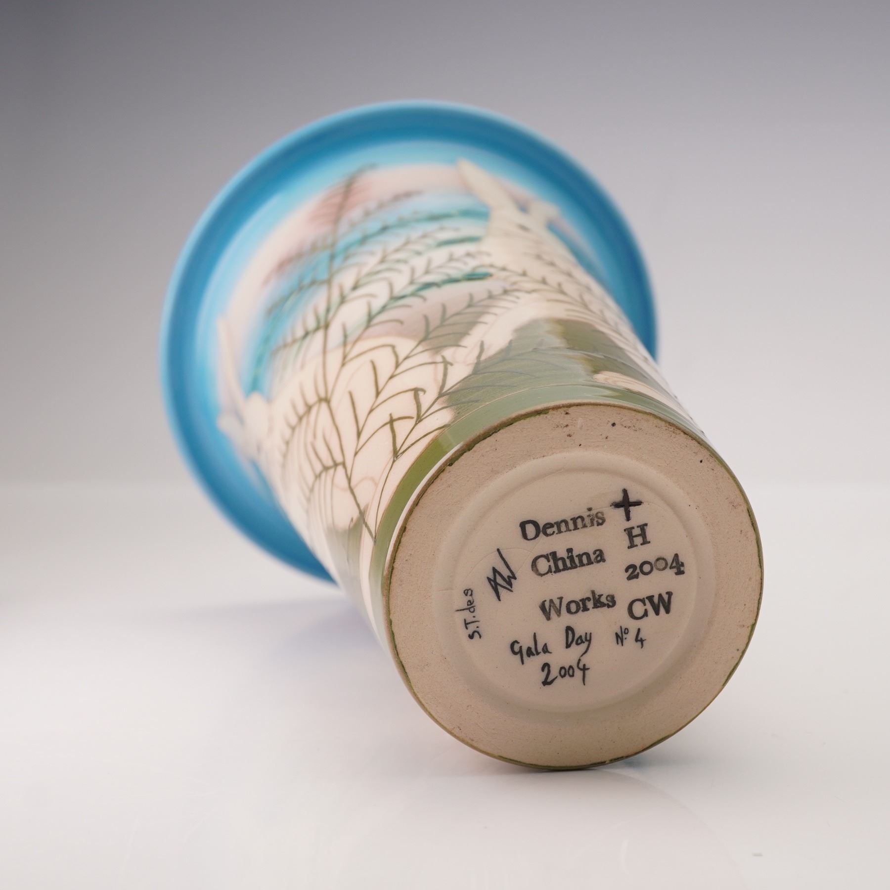 A flared rim vase designed by Sally Tuffin. The body decorated with tube-lined white hares amidst stylized winter foliage and set against a softly graduated blue and cream ground. Produced in a numbered edition, this is no. 4. Signed "S.T. des", "Gala Day", and the year "2004". Dennis Chinaworks backstamp.